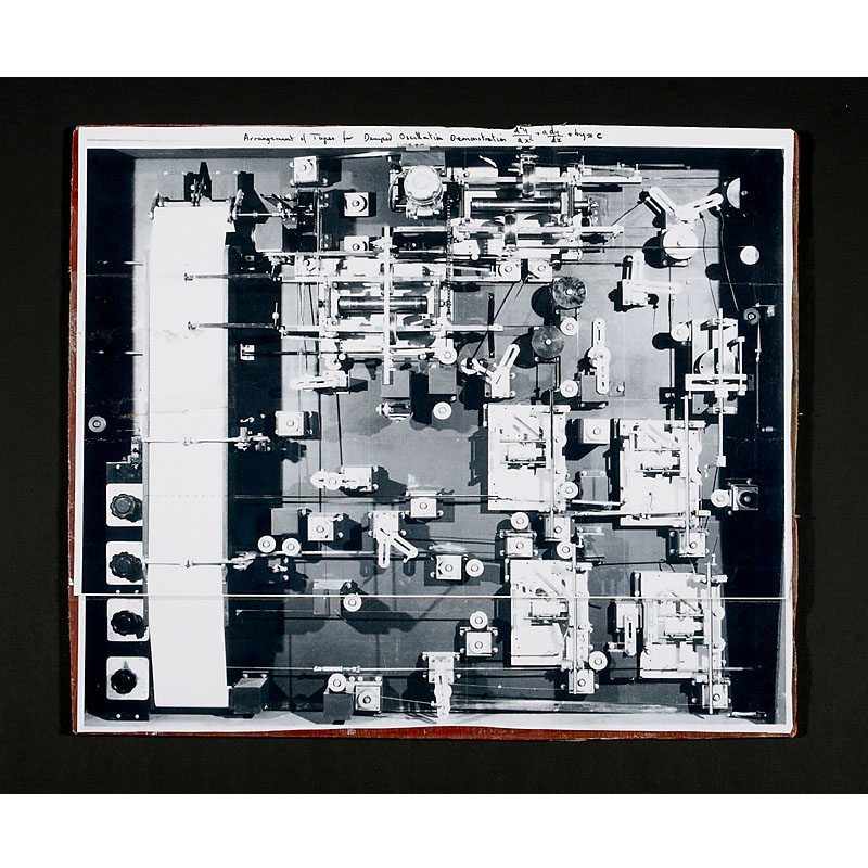Manufactured by Air Trainers Link Ltd., Aylesbury, England. World's 1st tape-operated mechanical analogue computer for flight simulation and teaching purposes, constructed along the concept of a "tape-connected" computer applied to large flight-equation s