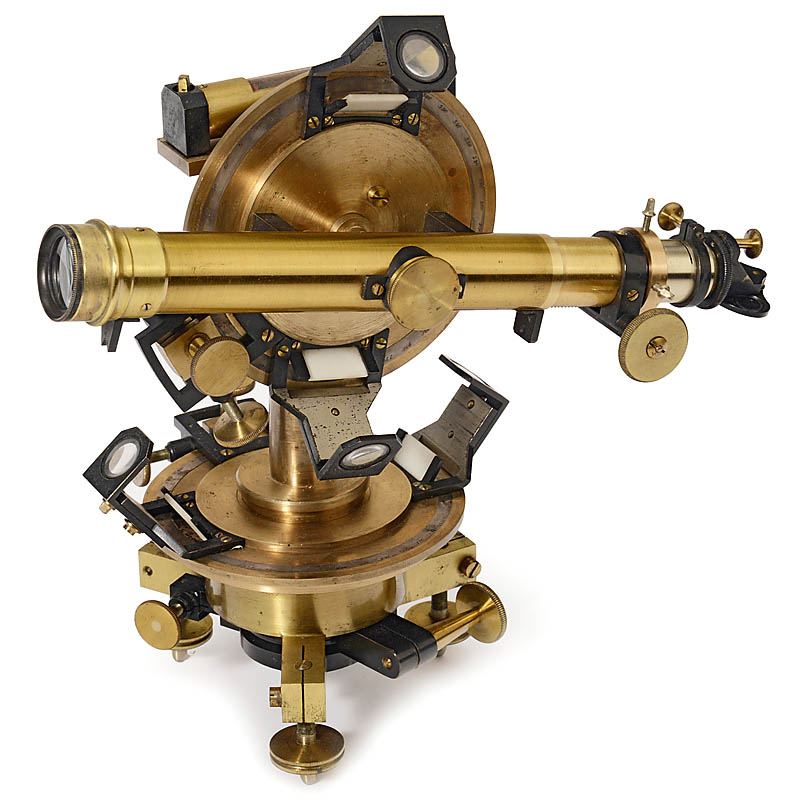 Signed: "A. Hurlimann – Ponthus Succs. à Paris", original lacquered brass, silver scales and verniers, 1 level, 4 magnifiers, telescope and rack-and-pinion focusing, length 9 ½ in., overall height 9 ½ in., with accessories in wooden case.