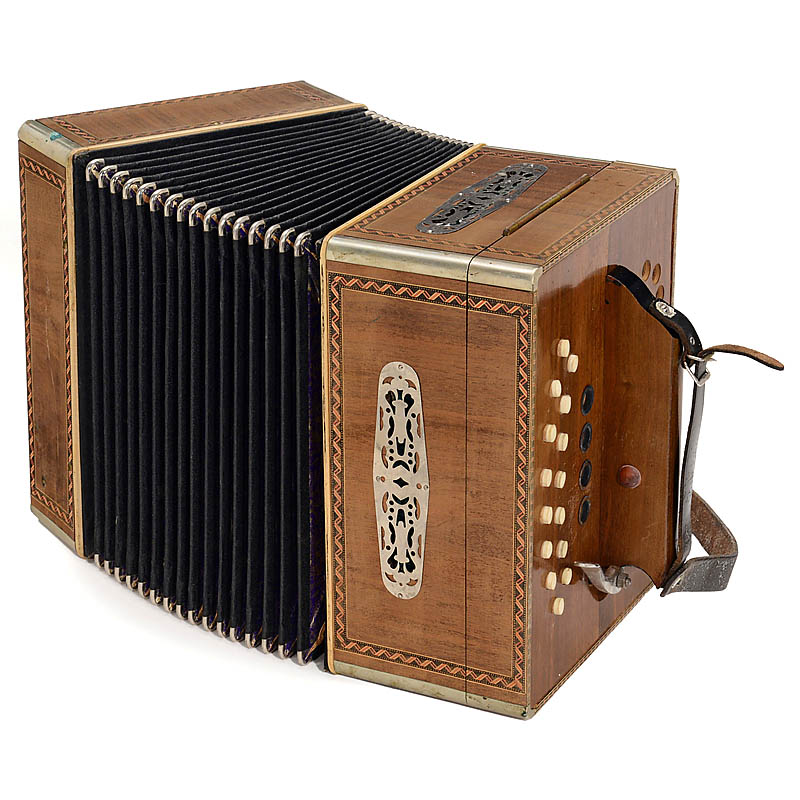 Manufacturer: "A. Zuleger, Leipzig", roll-operated player concertina, 28 notes, roll transport by flywheel drive, unrestored condition, partly rusty, in original case, with 9 rolls.