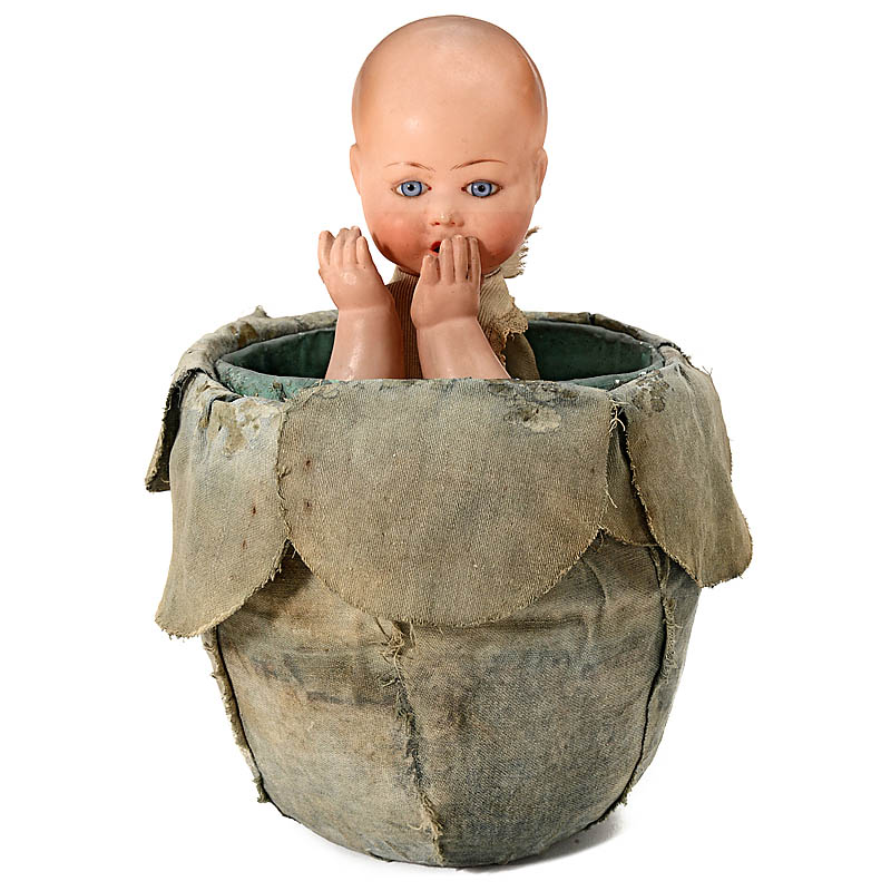 With celluloid head and hands, marked on neck "France, 25" and eagle symbol for Petitcollin, open-spring mechanism playing a single air as baby rises from the centre of cloth-covered papier-mâché cabbage, turns in a full circle, throws kisses and then ret