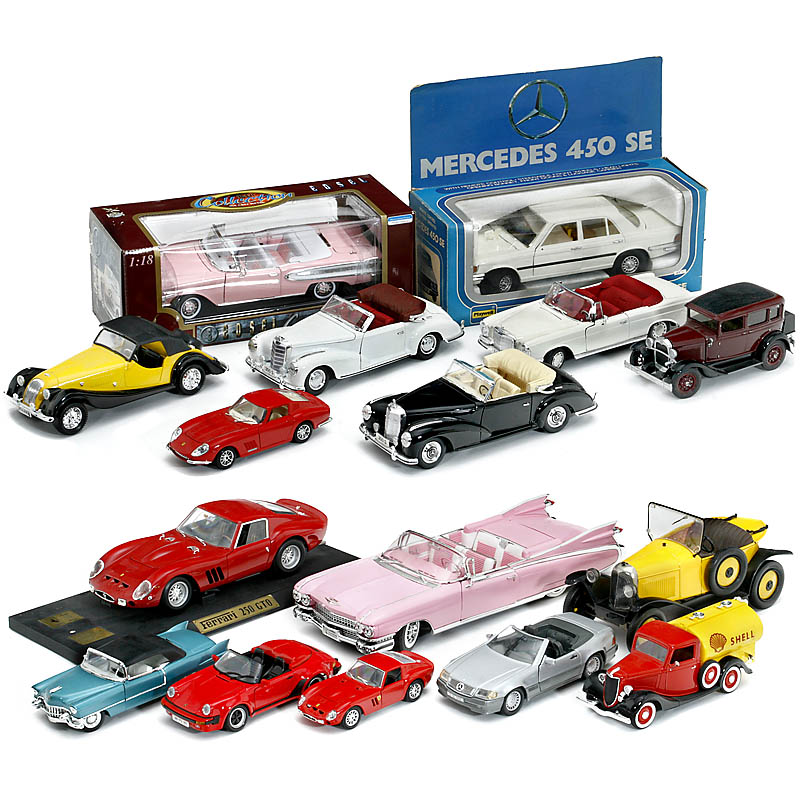 Vintage and racing car models, scales 1:12, 1:18 and 1:24; including pink Cadillac Eldorado, length 19 ¾ in.!