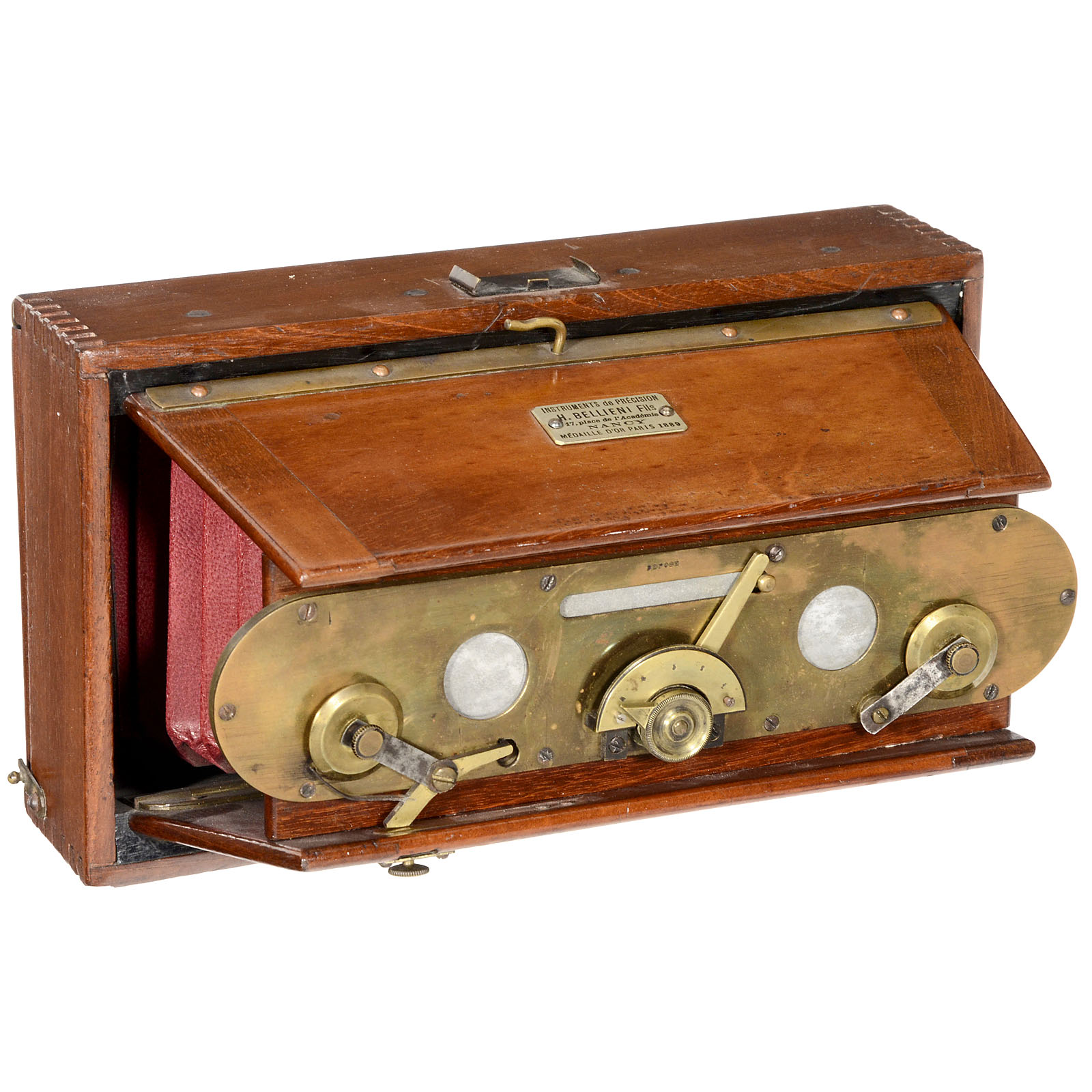 H. Bellieni & Fils, Nancy, France. Very early "Bellieni" stereo camera! Strut camera with "doors", walnut construction with brass fittings, plate size 9 x 18 cm, 2 x Aplanat 11/100 mm, brass lens board with variable guillotine shutter (5 shutter speeds), focusing screen back, without viewfinder. – Very rare! – Literature: Michel Auer, "The Guide to Antique Cameras", no. 2144.
