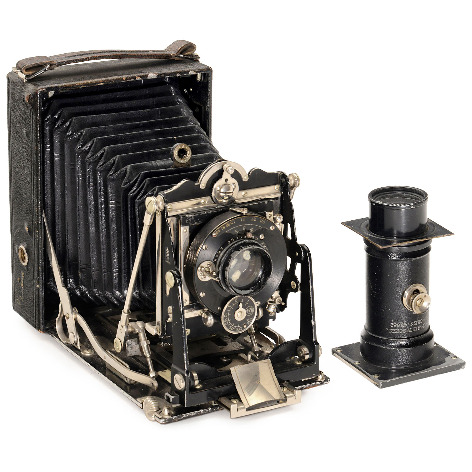 Rietzschel, Munich. Plate size 9 x 12 cm, unusual construction. With Linear 6,3/13,5 cm in Compound and Rietzschel "Tele Lens", focusing screen back. Rare combination!