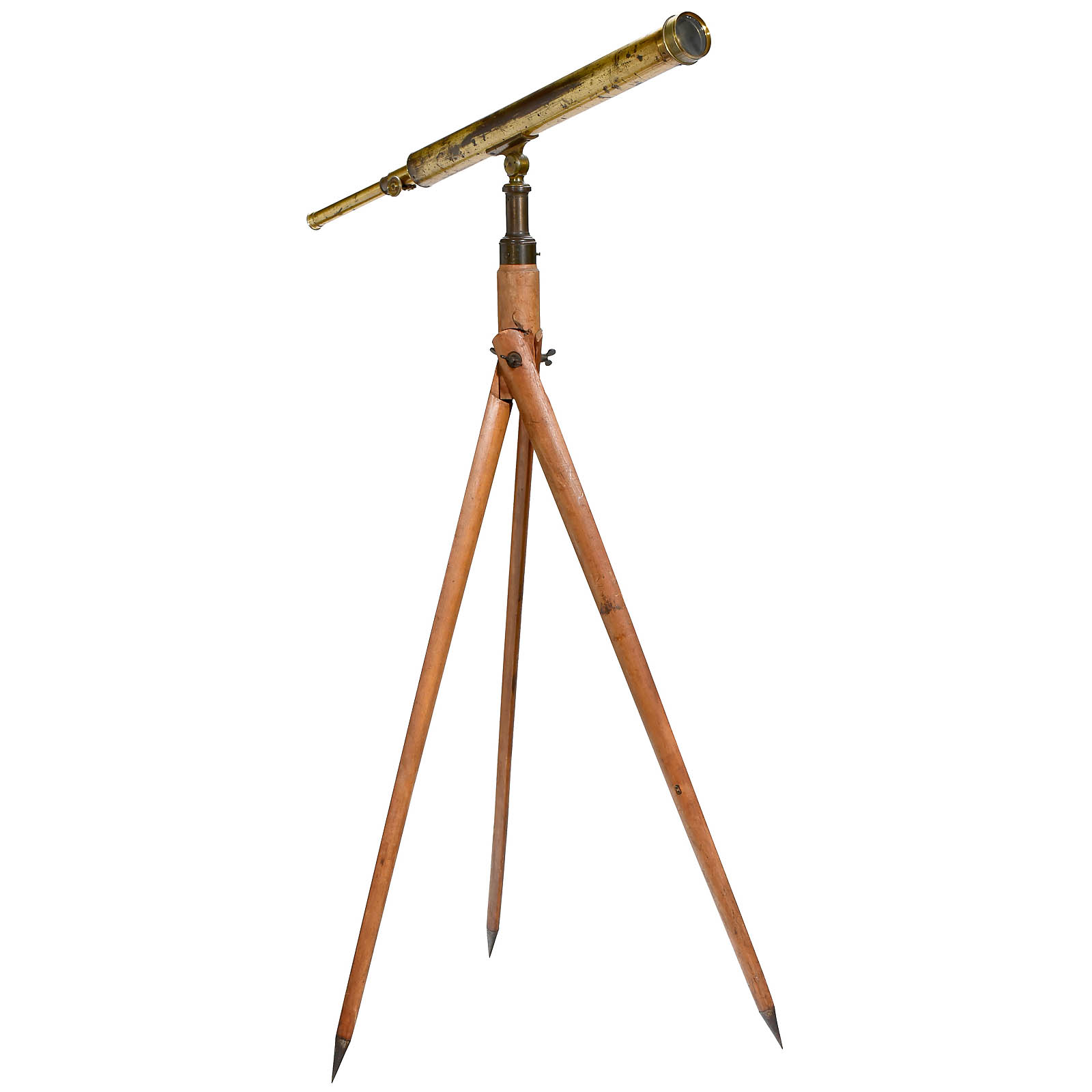 Signed on the tube: "Merz, Utzschneider und Fraunhofer in München" and "9. Oktober 1870 nach einem Scharmützel mit Mobilgarde auf dem Thurme bei Mereville vom Regimente erbeutet", length 39 1/3 in., rack-and-pinion focusing, on tripod stand. A Franco-Prussian War relic.
