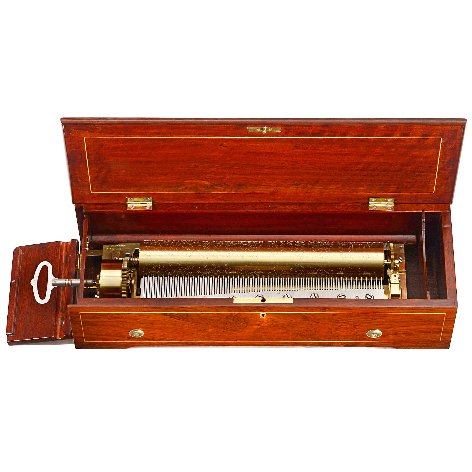 No. 28596, playing "Polka Baden-Baden No. 1", by Fessy, "The Gustave Galopp" and six other airs, with 96 teeth in comb (complete, lacquered), brass bedplate, instant-stop, partial tune-sheet and rosewood-veneered case, width 20 ½ in. (52 cm), cylinder 13 in. (33 cm), with later key, three nicely replaced teeth, movement and case in restored condition.