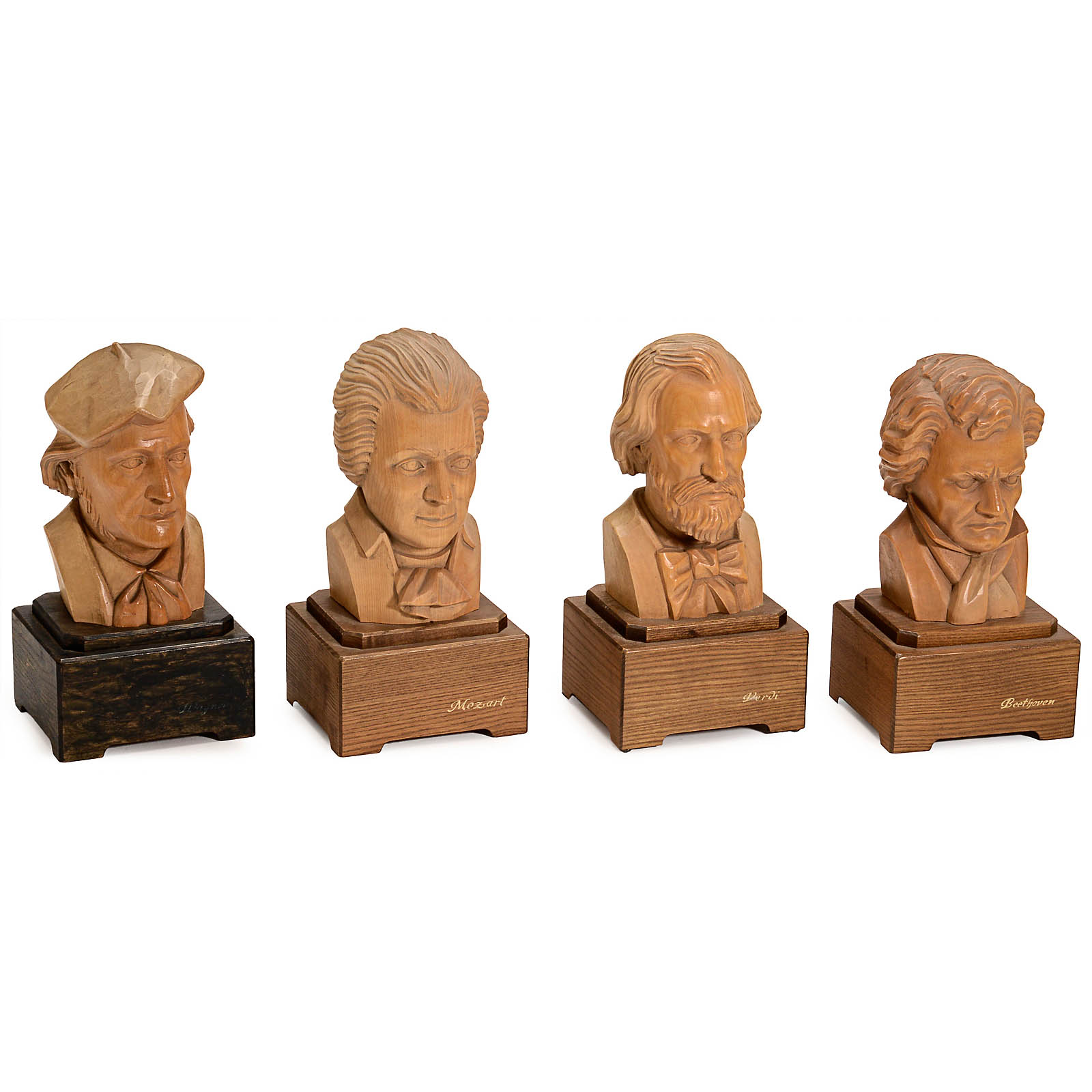 Handcarved busts of famous composers (Mozart, Beethoven, Wagner and Verdi), with Swiss 1-air cylinder movements playing music from the repertoire of each composer, height 11 in. each.