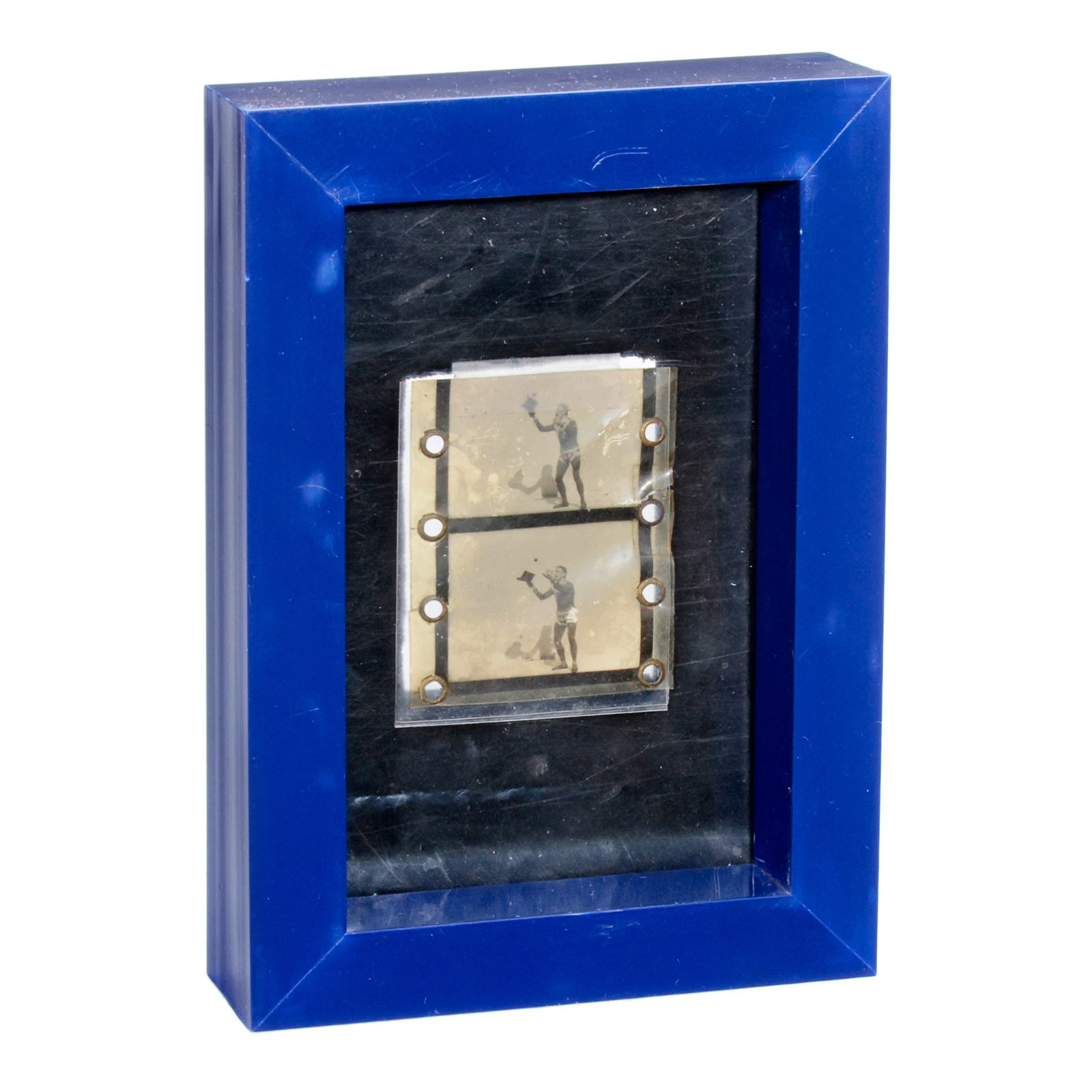 A strip of 35mm film with two stills showing the juggler Paul Petras (film perforations reinforced with shoe-lace eyelets), in glazed frame. The first public film projection took place in the Wintergarten music hall, Berlin, on 1 November 1895. The showman Max Skladanowsky invented a camera, projector and his own film format and filmed international entertainers against a white screen. The 15-minute performance of moving photographs created a sensation. Skladanowsky presented among others the vaudeville juggler Paul Petras, whom he had filmed in May 1895 in outlying Berlin district Pankow. An important piece of early film history appearing at auction for the first time!