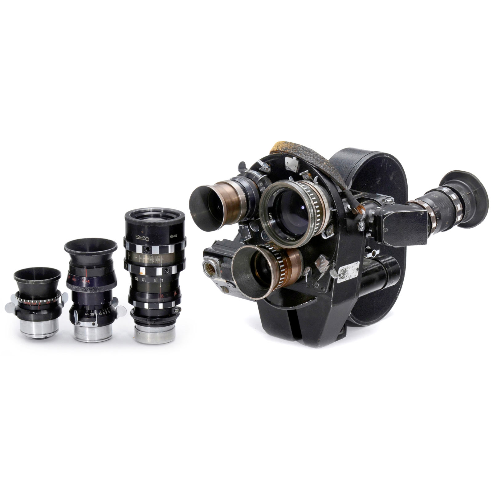Moskauer Kinowerke. 35mm movie camera with reflex viewfinder, for 60m and 120m cassettes, three-lens turret, 6 lenses: Lomo 1:2/28 mm, 1:2,3/35 mm, 1:2/75 mm, 1:2,3/50 mm and Jupiter 1:3,5/135 mm, one zoom lens: Lomo 1:4,3/37–140 mm, 3 cassettes 60 m, 2 cassettes 120 m, compendium, original case. – Electric functions not tested.