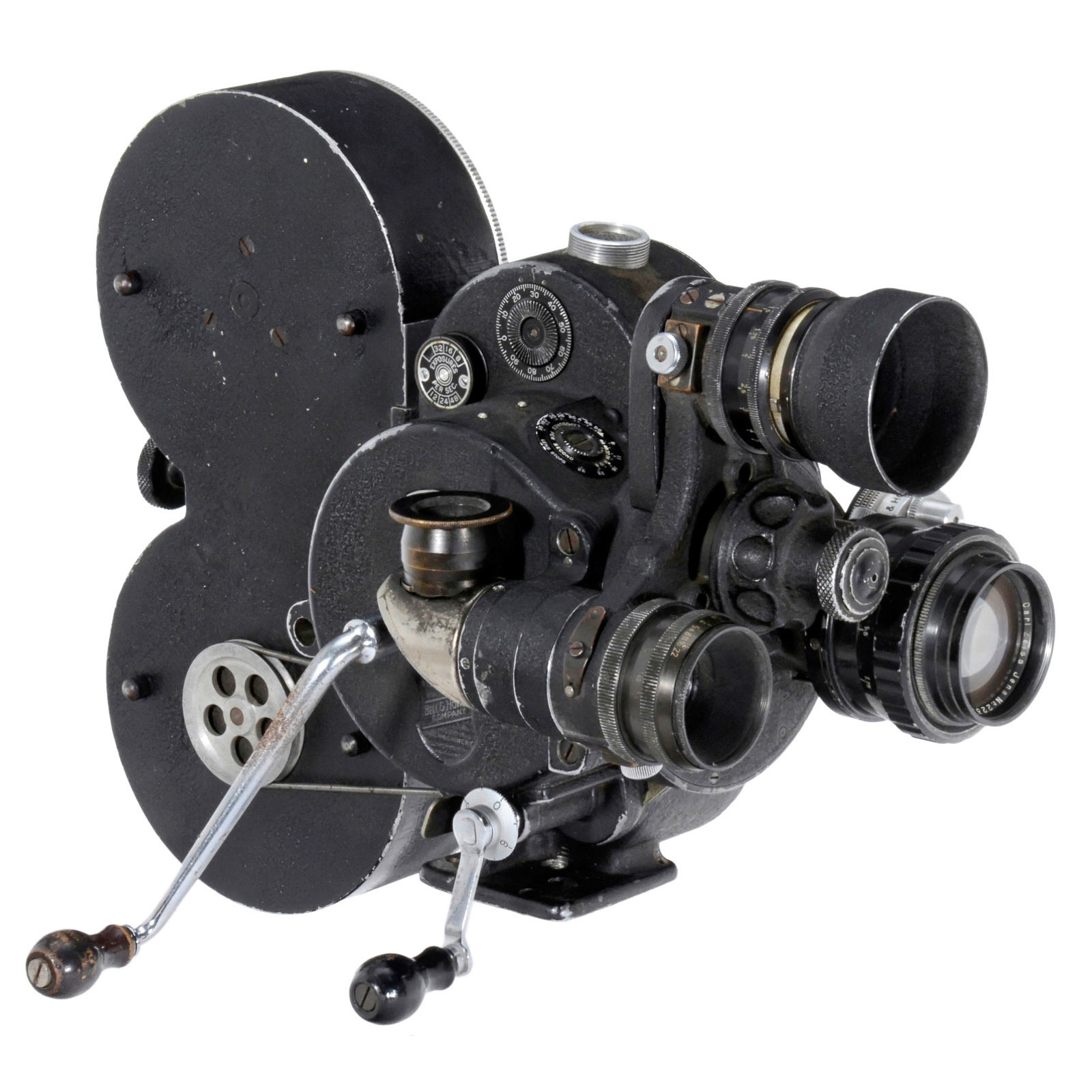 Bell & Howell, USA. 35mm reporter camera for 60m daylight cassettes. 3-lens turret: Zeiss Biotar 1:2/50 mm, Sonnar 1:2/85 mm and 1:1,5/50 mm, clockwork drive, with 2 handcranks. Popular newsreel camera in WWII and Korean War.