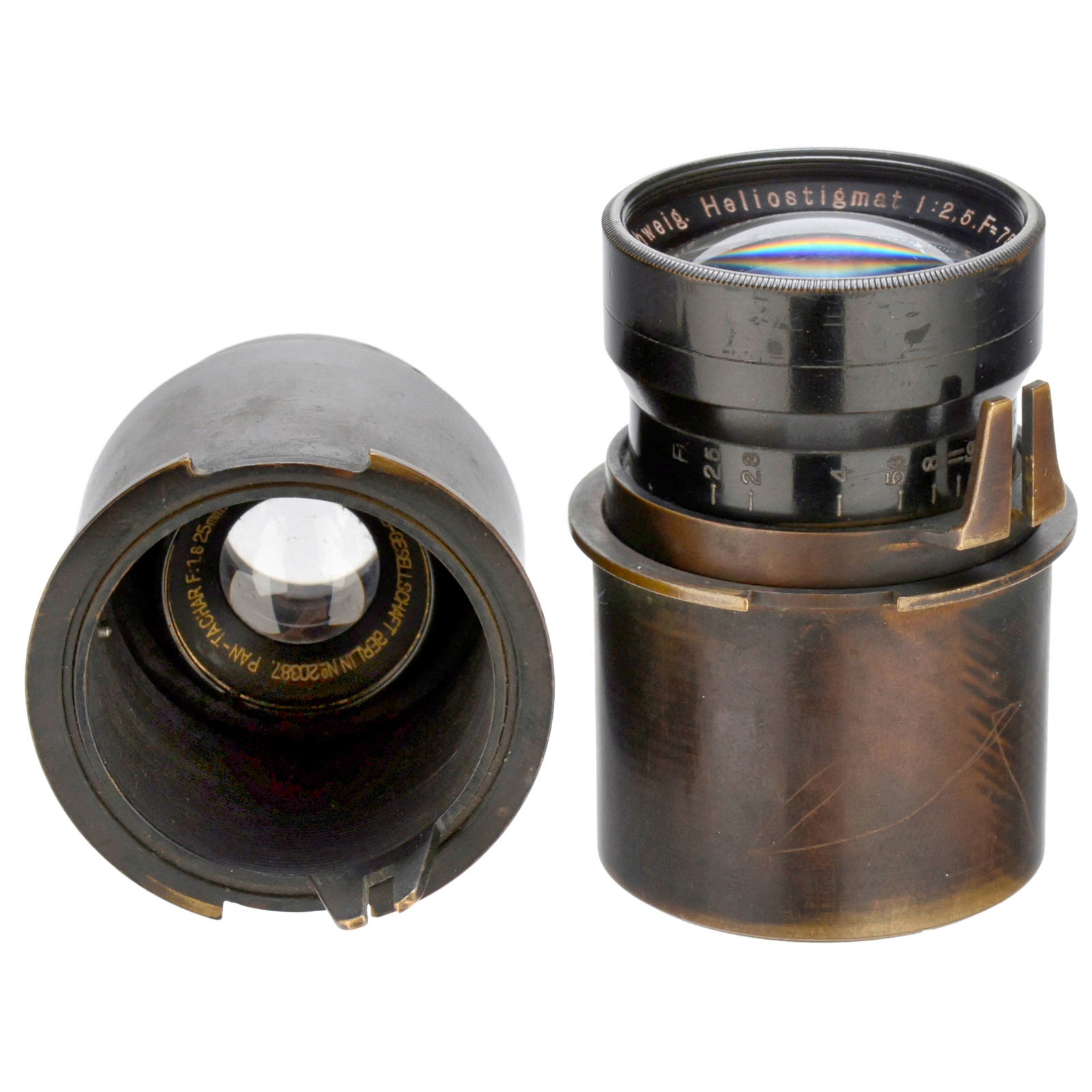 Presumably for Parvo-K. 1) Voigtländer, Braunschweig. Heliostigmat 2,5/75 mm, no. 474438. – And: 2) Astro, Berlin. Pan-Tachar 1,8/25 mm, no. 20387. – Lenses slightly dirty inside.