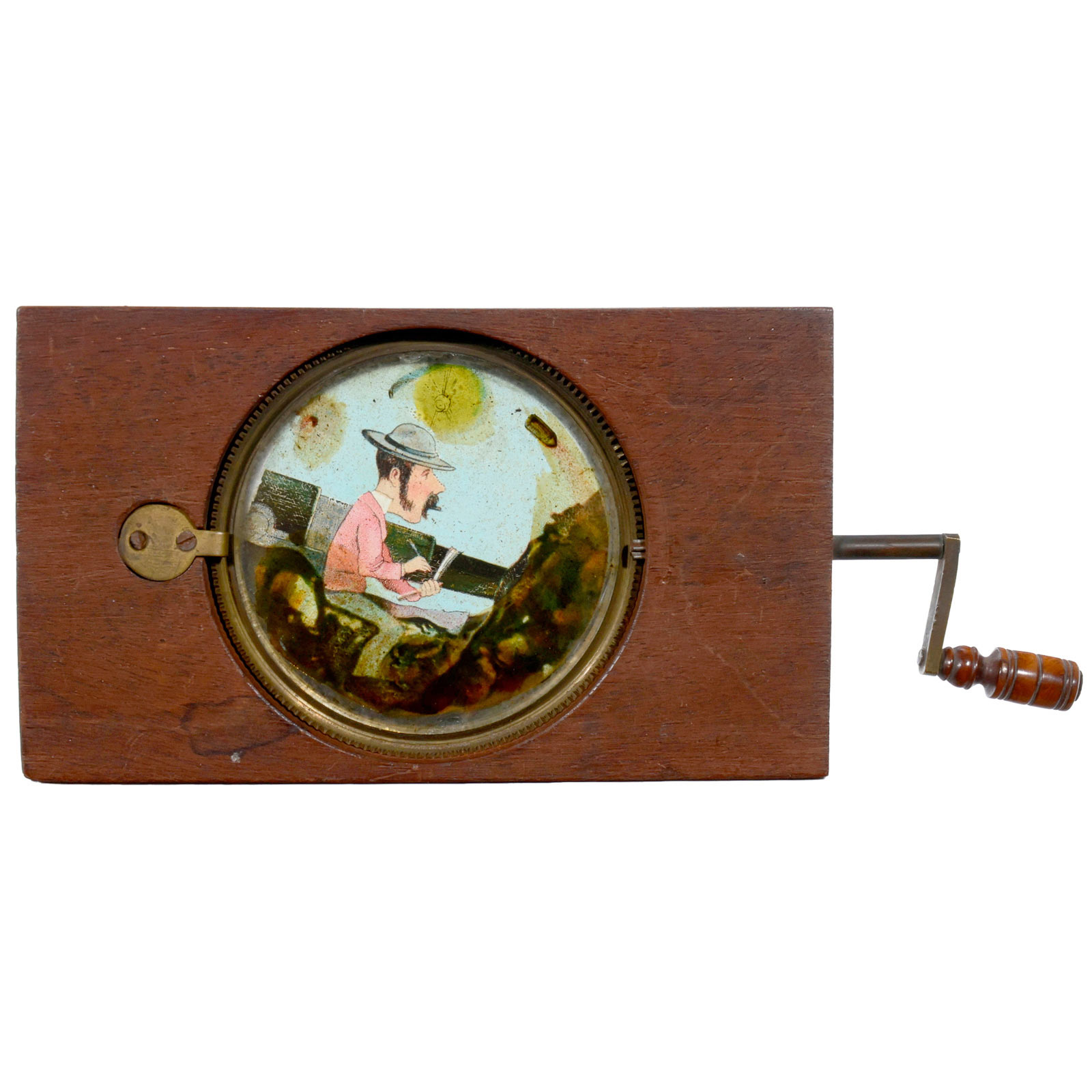 England, wood-mounted rackwork transfer slide (4 x 6 ¼ in.) depicting a trench artist sketching beside a machine gun as projectiles and explosions appear above his head, overall good but sticking slightly. – A rare motif!