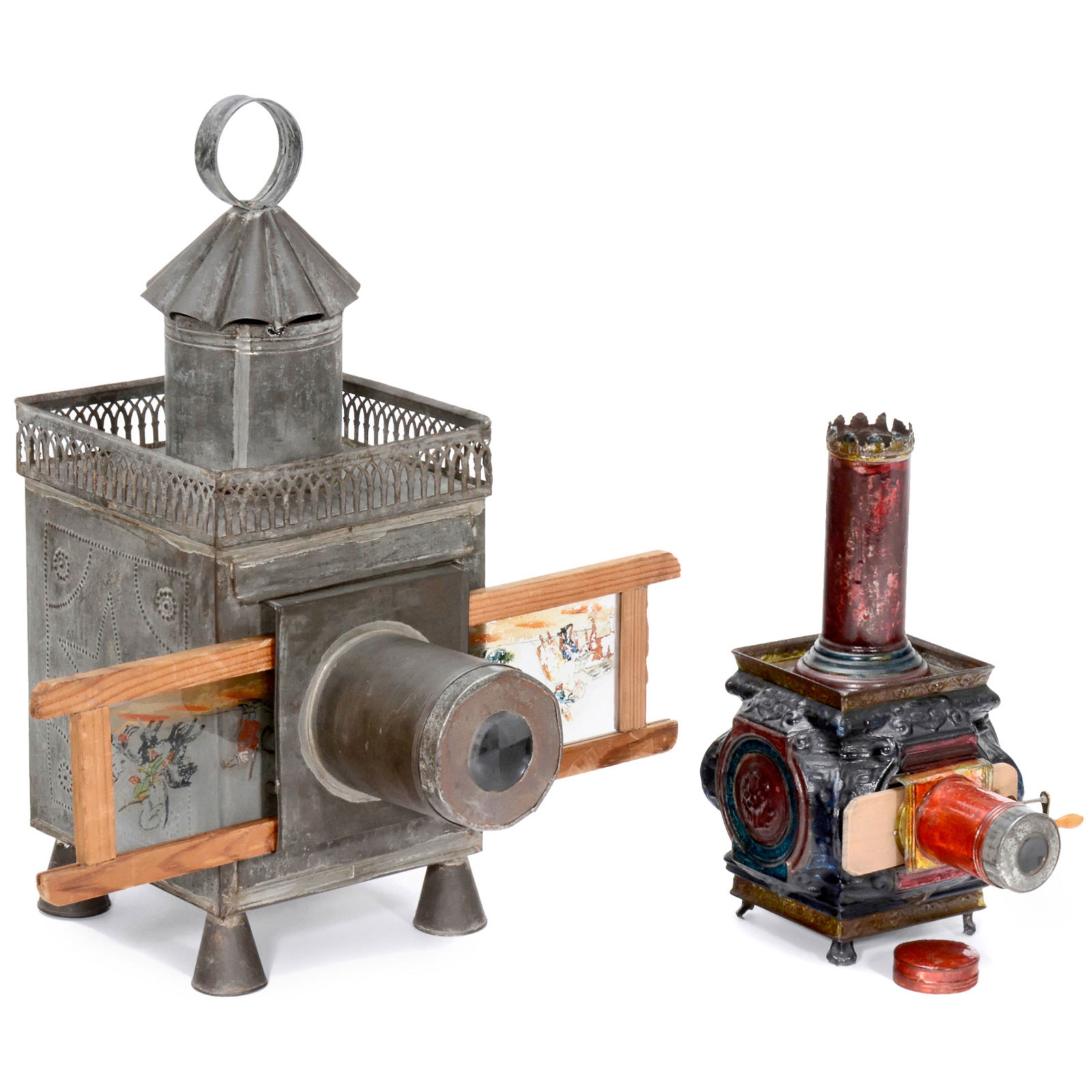 Frères Lapierre, Paris. 1) Carrée, c. 1860, tin plate, height 15 in., lens not original. With burner and hand-colored slide (4 ¾ in.). – And: 2) Lampascope, c. 1880, for 1 ½ in. slides, height of the lantern 10 5/8 in. (repainted).