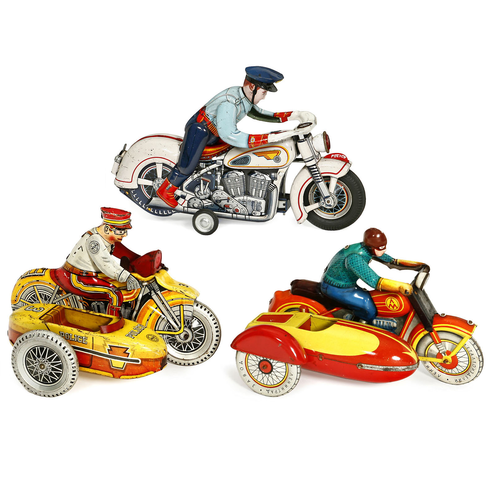 1) Marx, USA. "Rookie Cop", with sidecar, lithographed, clockwork (working), with siren, length 8 ¼ in. – 2) Russian motorcycle with sidecar, lithographed, clockwork (working), length 8 ¾ in. – And: 3) Modern Toys, Japan. Trick police motorcyclist, lithographed, battery (untested), length 11 ¾ in.