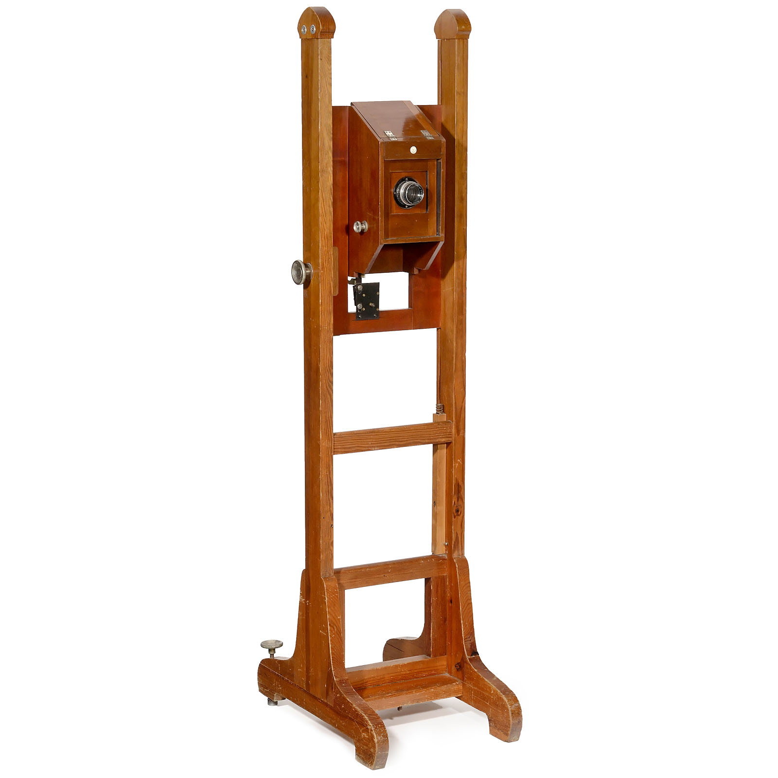 Body no. 25, for up to 6 pictures witz size 3,5 x 5 cm on plate 12 x 16 cm, other formats eligible, Meyer Helioplan 4,5/65 mm, reflex viewfinder, back with plate cassette, height with tripod 65 in. – Infrequent offering!