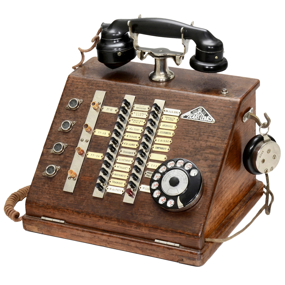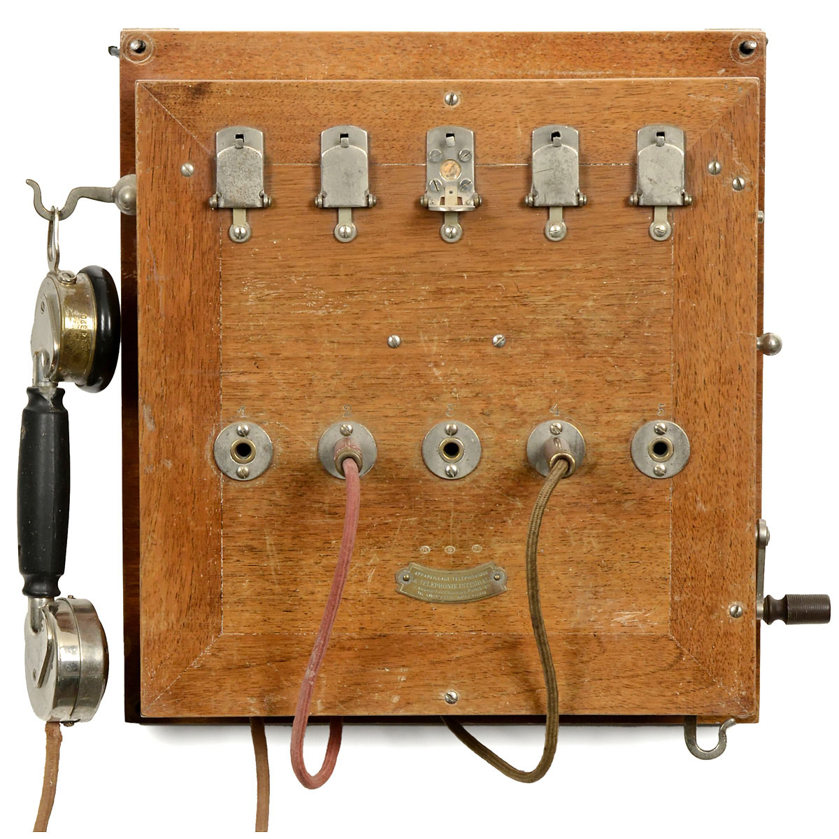 1) Intercom switchboard by Picard-Lebas, Paris, wooden case, with additional earphone, c. 1935. – And: 2) Switchboard for 5 lines, marked "La Telephonie Integrale", 2 plugs, crank-driven inductor, c. 1931.
