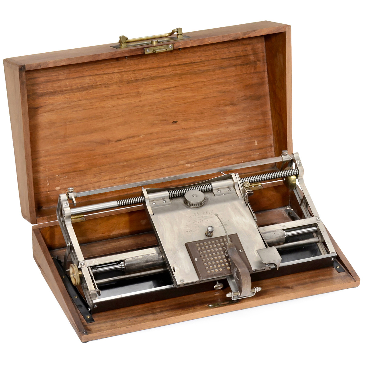 First real portable typewriter in the world. From New York, USA. Serial no. 1147. – With type scale, typeface (new) and original wooden case. – A very desirable historical collector's item!