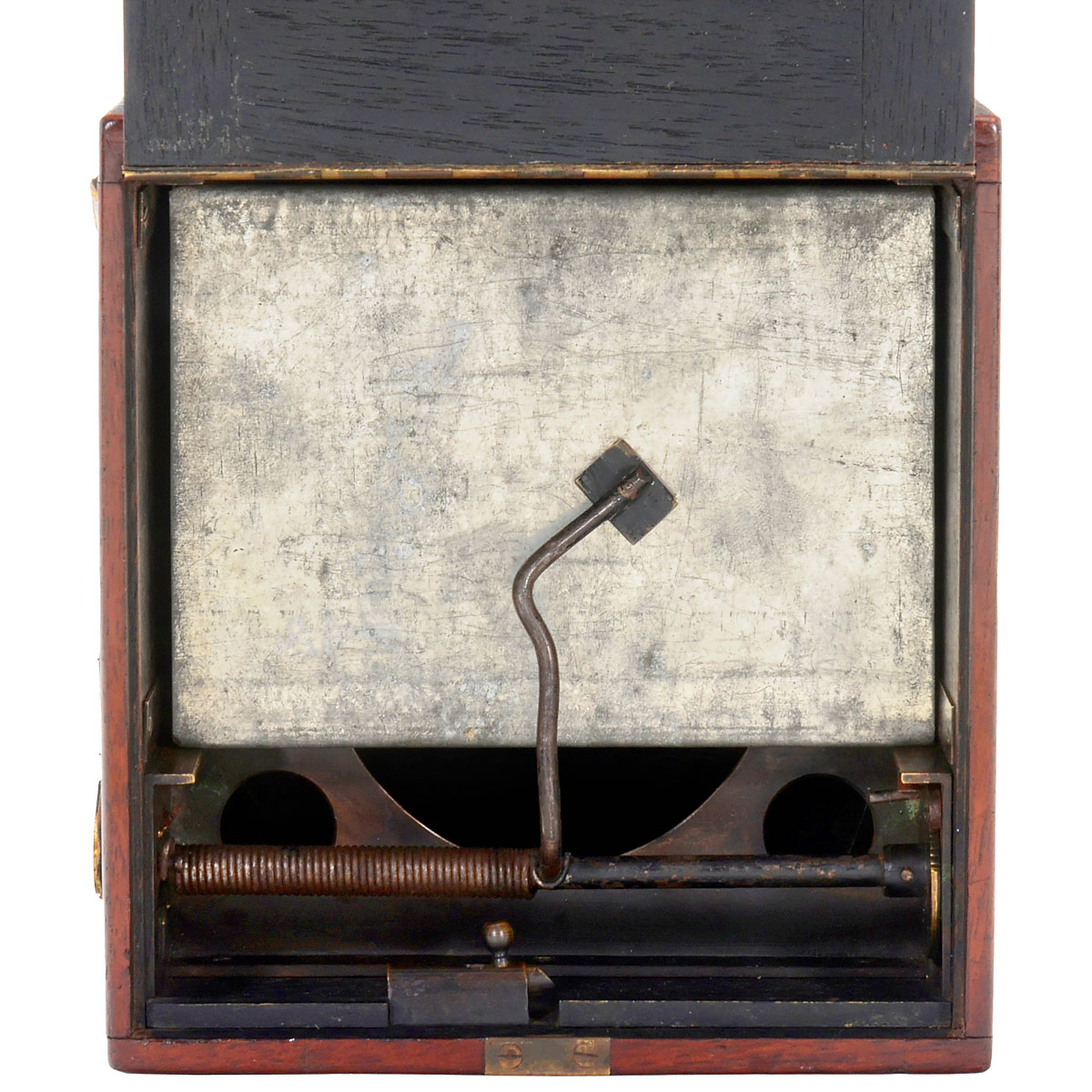 First camera in the world with a clockwork motor! Designed by Georges Maroniez. Clockwork drive for 9x12 cm plate-changing and shutter winding. Brass lens (Aplanat type) with rotating stop, shutter: "Inst." and "Pose", tropical wooden body with two viewfinders, footage counter and cassettes (inside). – A milestone of camera technology. – Museum quality! Excellent condition! – Literature: Michel Auer, "Kameras gestern und heute", p. 123.