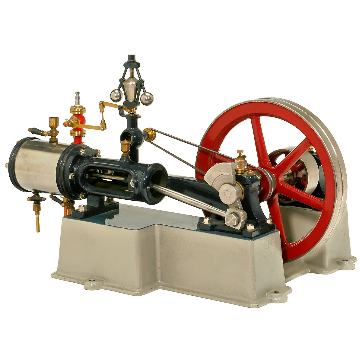 Cast iron and steel, cylinder Ø 2 1/3 in., flywheel Ø 7 in., 3 glass oil containers, working flywheel, size 14 ½ x 9 x 9 7/8 in., working!