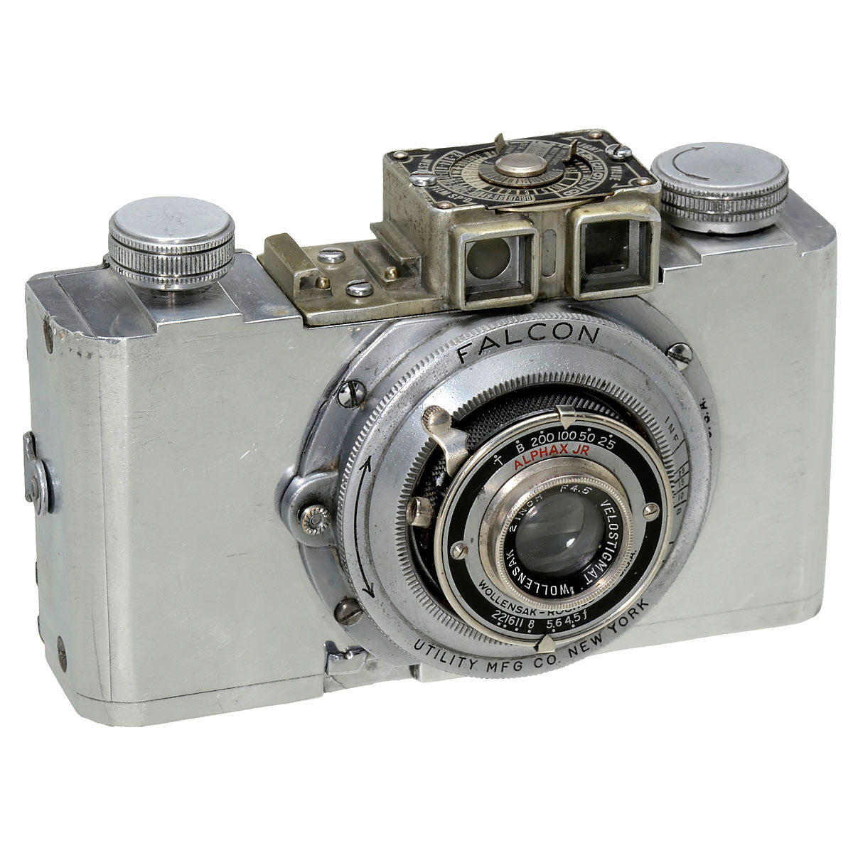 Utility Mfg. Co., New York. The Falcon Special production model has a bakelite body with cast-metal back. The example here is machined from pure aluminum. For 3 x 4 cm exposures, with integrated extinction meter. Wollensak Velostigmat 4,5/2 in. in Alphax Jr.