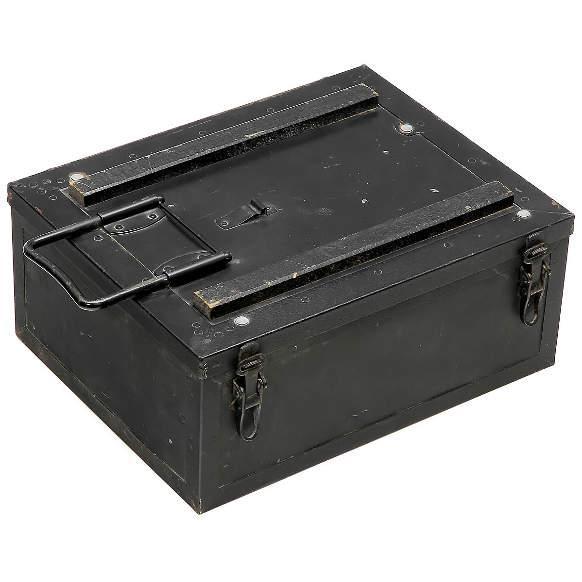 Original metal case for a German Second World War Enigma machine as used by the German armed forces (including the airforce), for extra protection of the mechanism, size 13 ¾ x 10 5/8 x 6 ¼ in. Well-preserved original paint. An extraordinary and rare exhibition piece.