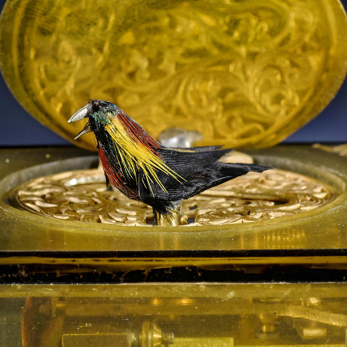 With exposed going-barrel motor, automaton bird with multicolored plumage, moving metal beak, wings, tail and perch, in celluloid case with pierced gilt grille, copper relief depicting a pair of birds and asymmetrical geometric designs in corners of the lid, 2 3/8 x 4 in. (6 x 10 cm). Excellent working order. With brass bird-form key, in modern traveling case. – A striking and unusual design.