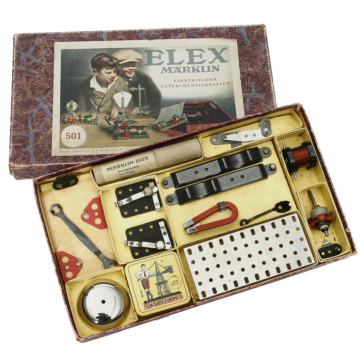 1) Lehmann Tap-Tap, lithographed tin, clockwork working. – And: 2) Märklin electrical experimentation box no. 501