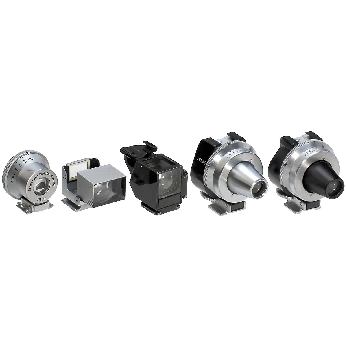 Leitz, Wetzlar. 1) Waist-level viewfinder AUFSU, with accessory shoe. – 2) Folding 2,8cm viewfinder SUOOQ, chrome. – 3) Brightline viewfinder SHOOC, 13,5 cm, feet, with case. – 4) Universal viewfinder VIOOH, pinched, black nose, meter. – And: 5) Universal viewfinder VIOOH, sloped, meter, with case.