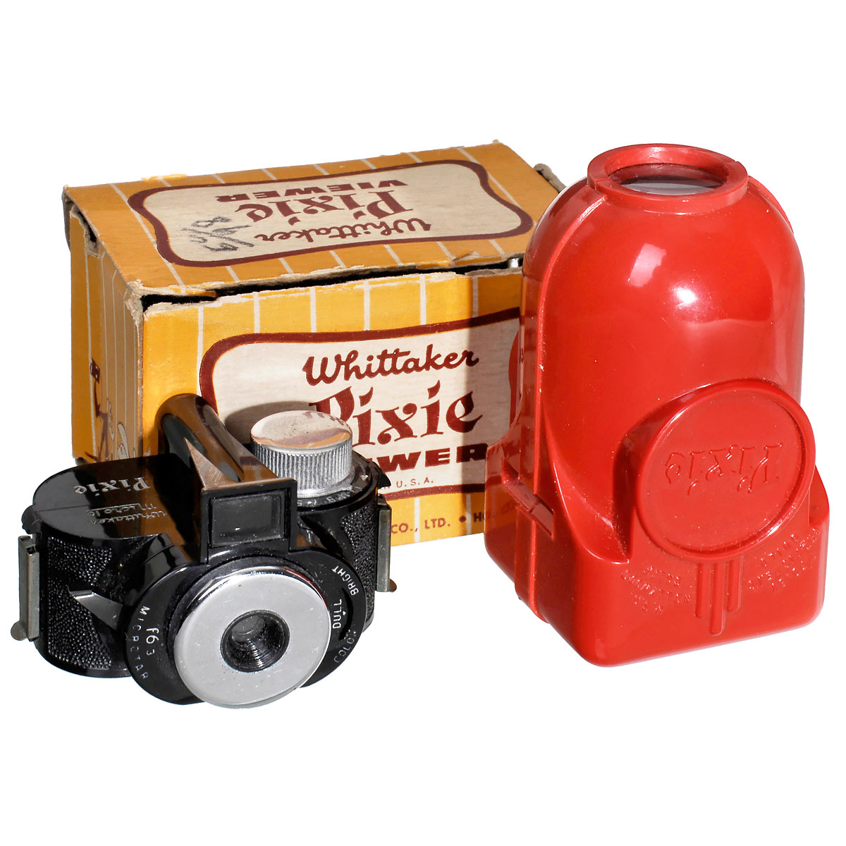 Whittaker C. Los Angeles, USA. Unusual small subminiature camera, size 10 x 14 mm on 16mm film in magazine (not included), lens: Microtar 1:6,3, simple shutter. With very rare "Pixie" viewer in red, original box.