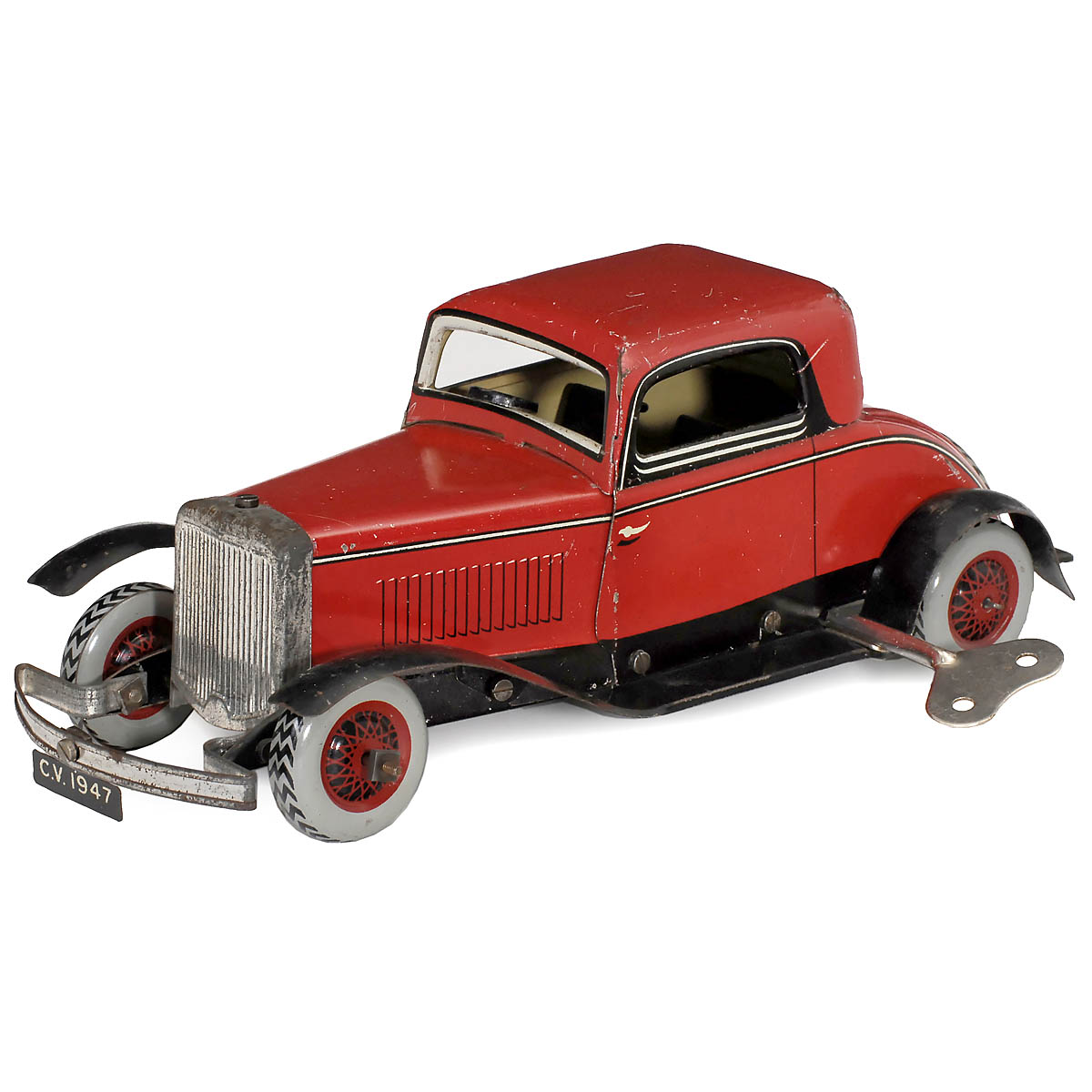 Chad Valley Co. Ltd., Harborne, England. License plate C.V.1947, red/black lithographed tin, length 10 1/5 in., spring-driven (working). - Good condition!