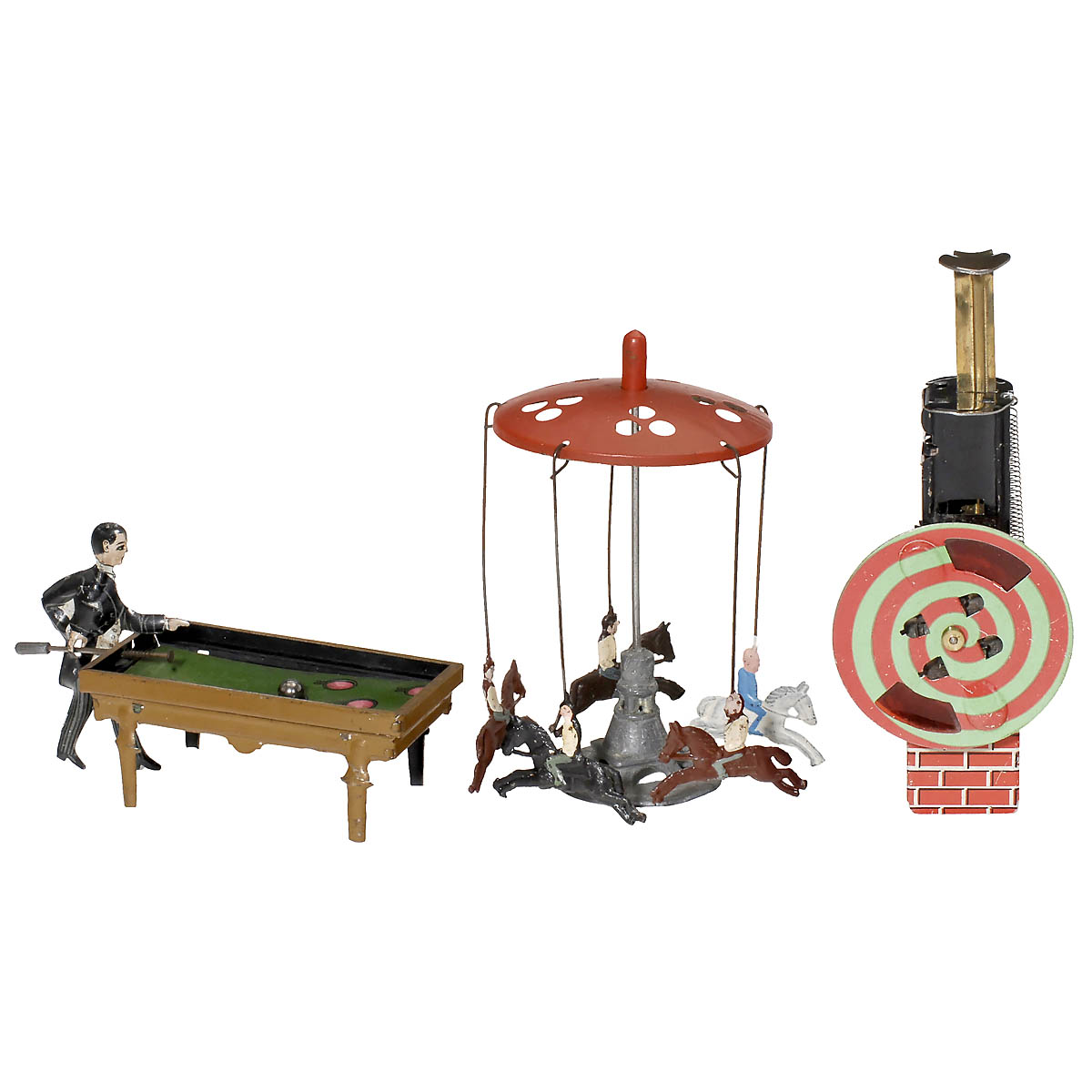 1) Billiard player, lithographed tin, with steel ball. - 2) Horse merry-go-round, with 5 lead horses. - And: 3) Mechanical chimney sweep, with flints.