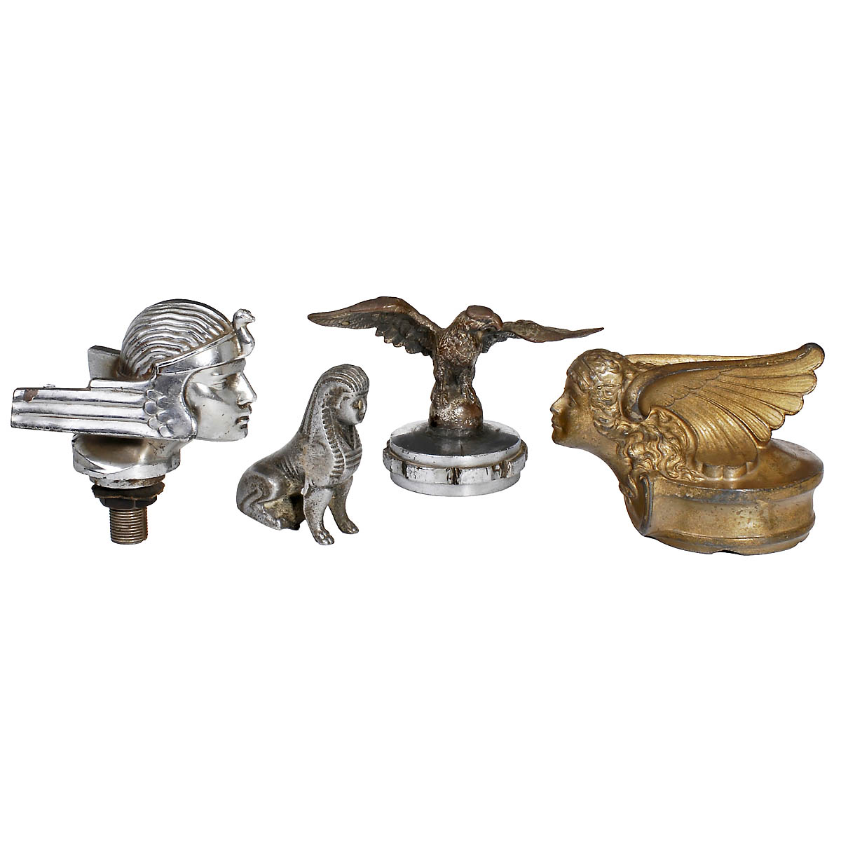 1) Stutz Blackhawk, Ra, the sun god, bronzed. - 2) Buick, winged goddess, nickeled. - 3) Eagle, bronze, on cap. - And: 4) Maahes, Egyptian lion god, aluminum.