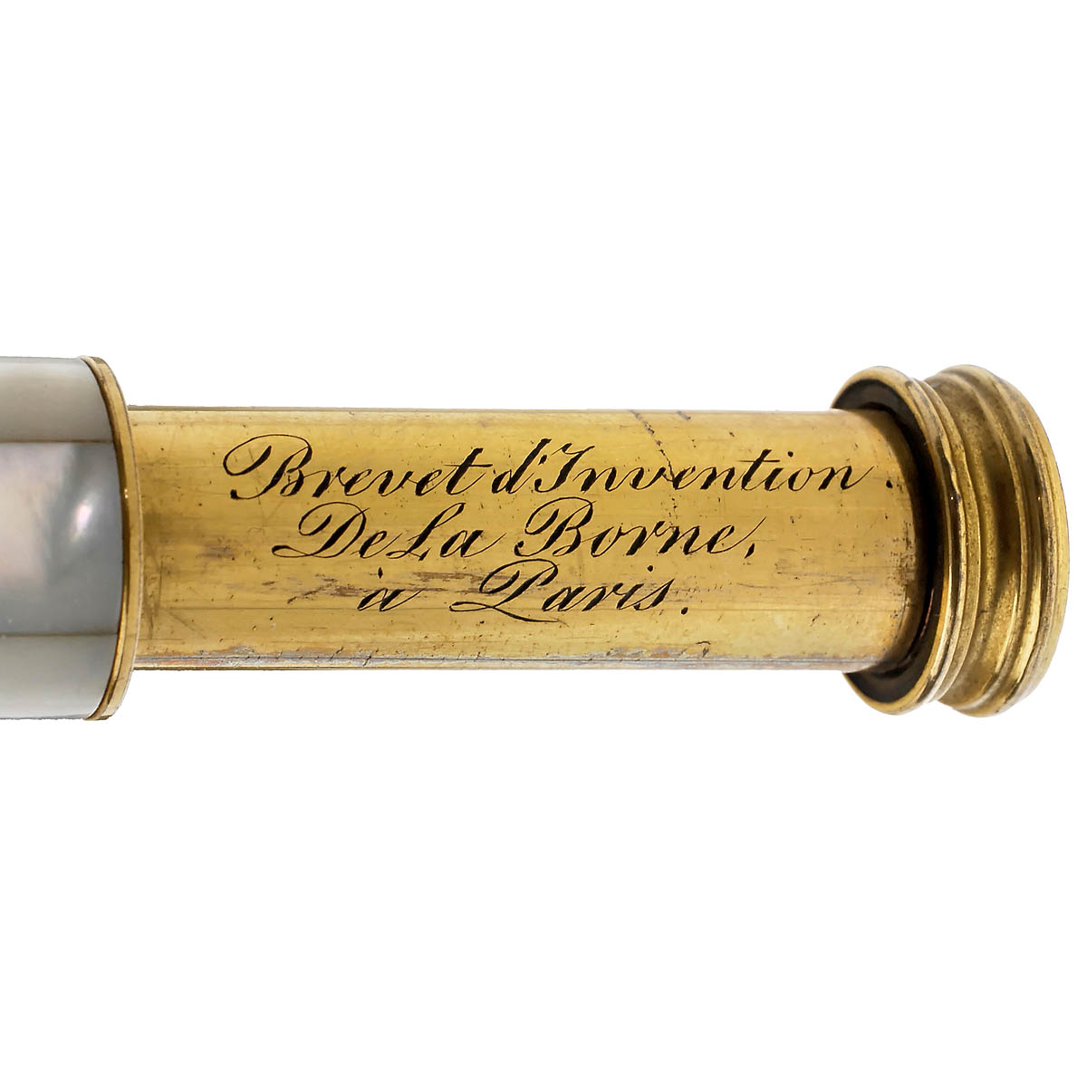 1) Very rare French 5-draw telescope, c. 1820, gilt-brass, body decorated with 2 lines of pink stones and 5 magnificent square Pâtes de Verre, Ø 1 1/3 in., extended length 2 4/5 in. - And: 2) Elongated single-draw French telescope, c. 1840, gilt-brass, signed "Brevet d'Invention De La Borne à Paris", body covered with mother-of-pearl, length extended 4 ¼ in.