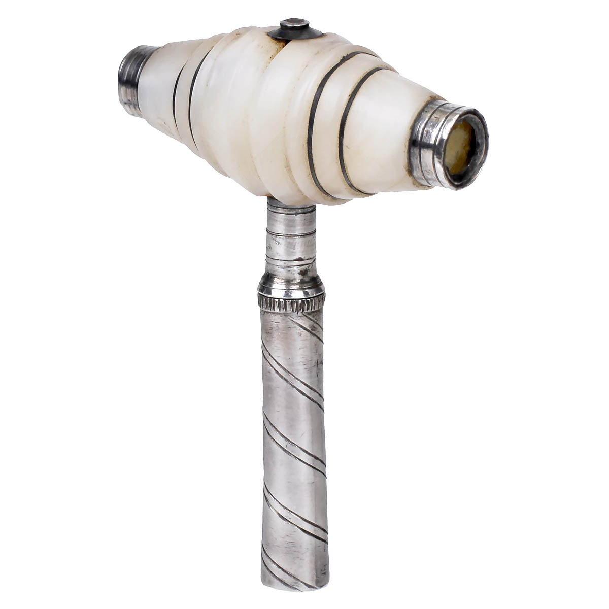 France. Silver, hallmarked: Paris, 1786-1789, mother-of-pearl body, height 2 ½ in., length 1 ¾ in. Exhibited in 2011 at Zilver Museum Sterckshof, Antwerp, Belgium. - See: Musée de la Lunette, Morez, France, and Il Museo Dell'Occhiale, Belluno, Italy. - In original velvet-lined leather case.