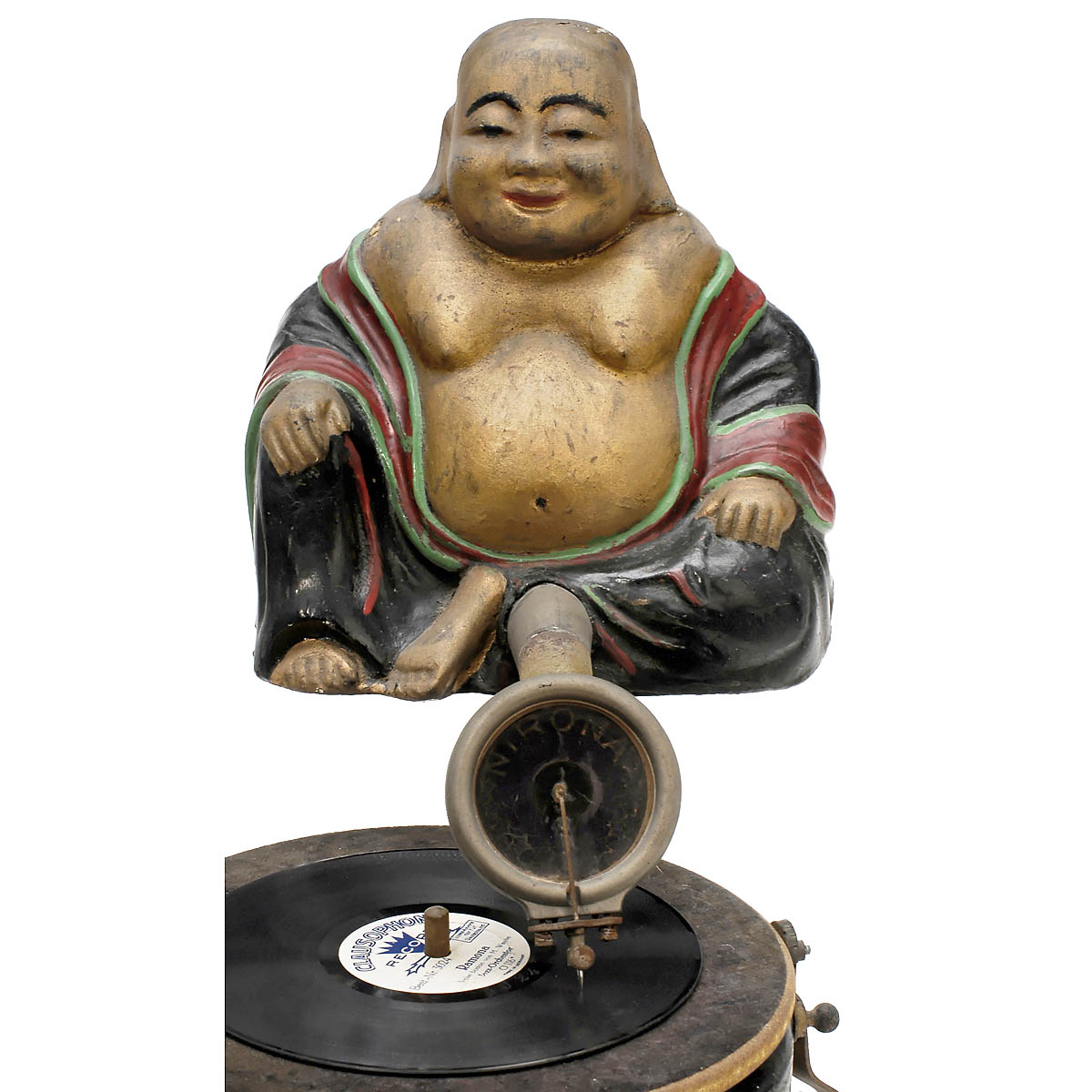 Unusual Gramophone, hand-painted papier-mâché Buddha figure as loudspeaker and resonator, Nirona soundbox, metal body with dragon motif, working condition, needs cleaning.