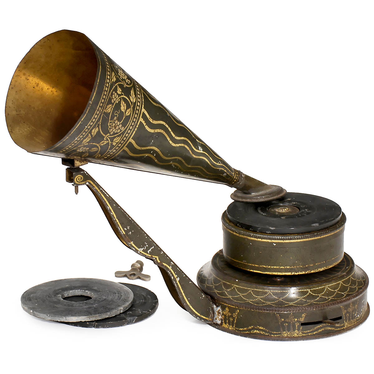 For Ø 3 1/6 in. chocolate discs, turntable doubles as disc-storage compartment for 6 discs, original green lithographed finish with gilt highlights, in good condition (tone arm refixed), sapphire incomplete, Junghans spring motor, with 3 original chocolate discs (one broken), rare maker's box (torn). - Working. Very rare!