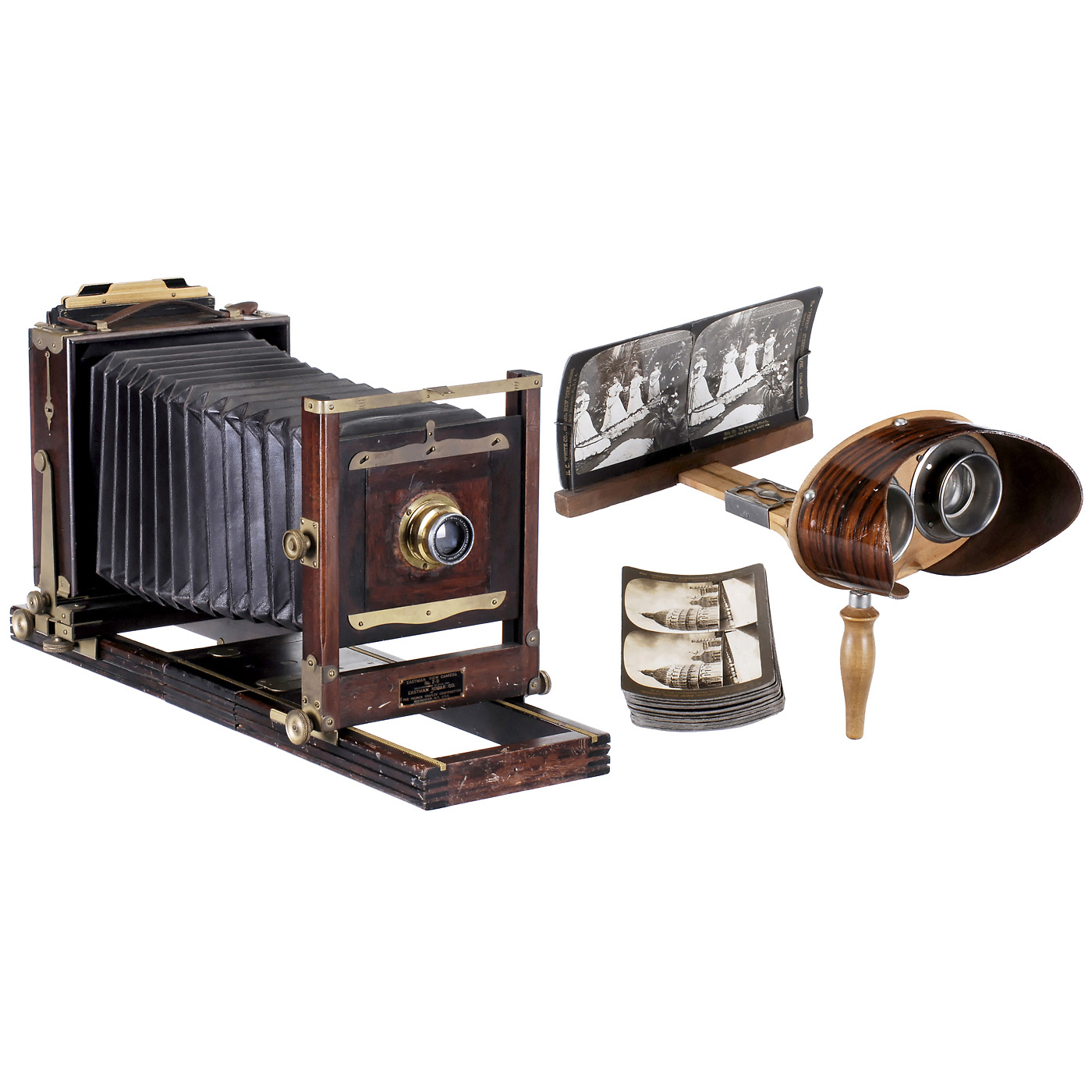 Eastman Kodak, USA. Professional plate camera, 5 x 7 in., swing back, dark tropical wood with brass fittings, with Goerz Dopp.-Anastigmat Dagor 6,8/180 mm with iris stop, focusing screen back. (3/3) - In addition: Holmes-pattern stereo viewer "The Stereo-Grapho scope", c. 1890, with 15 stereo cards of 9 x 18 cm (predominantly Italy), small spot of veneer on mask missing. (3/2)