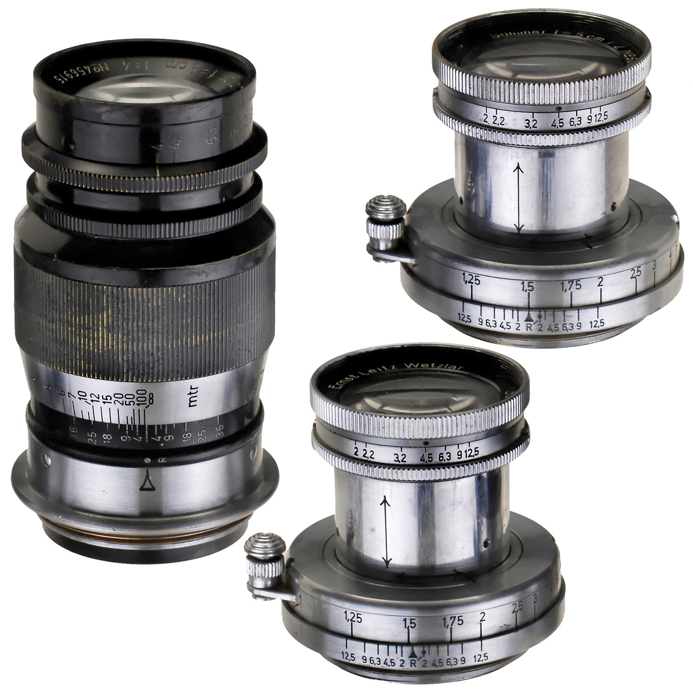 Leitz, Wetzlar. 1-2) 2 x Summar 2/5 cm, meter, no. 497946 and no. 503480. - And: 3) Elmar 4/9 cm, meter, no. 456915, both lens caps.