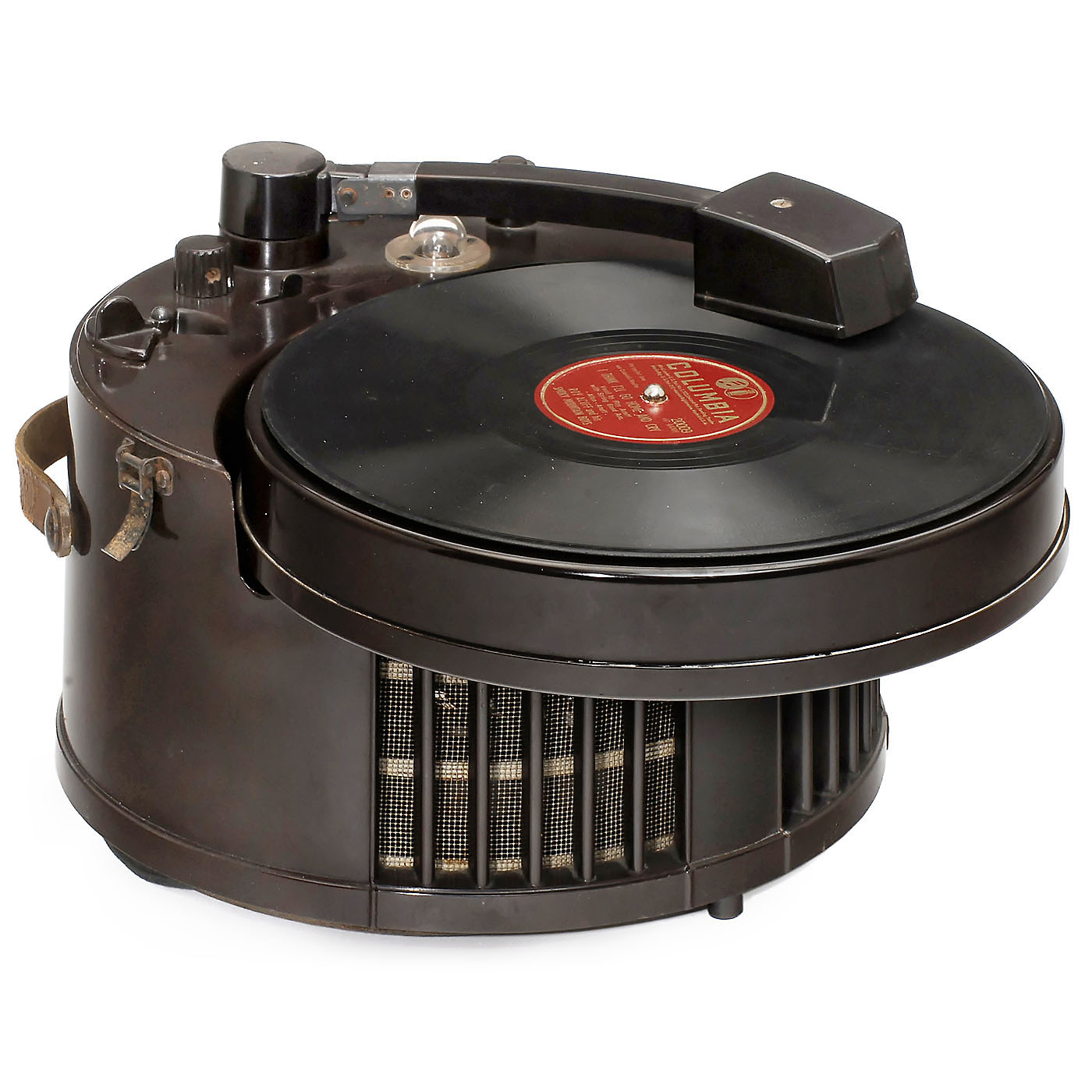 Eindhoven, Netherlands. Bakelite, lid serves as turntable, Philips 2984 pick-up, inbuilt 2-valve amplifier, Philips 9712 loudspeaker, 78 rpm, 110-245 V mains-power, original condition, hairline crack on rear. Affectionately known to collectors as "the hatbox".