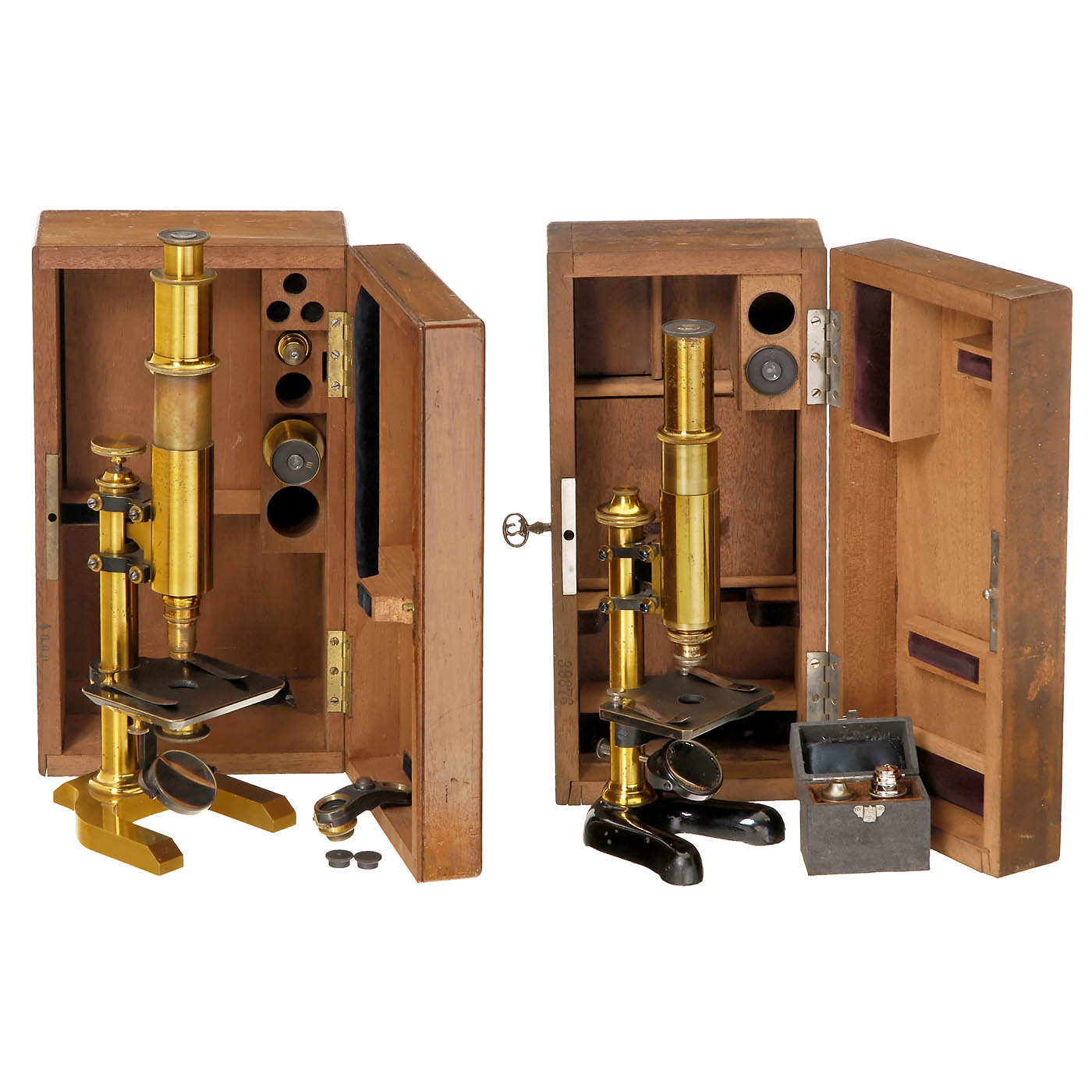 1) Ernst Leitz, Wetzlar. No. 39876, original lacquered brass, black horseshoe base, 2 eyepieces, 3 objectives, height 10 1/5 in., in matching mahogany case with identical serial number, 1896. - And: 2) Seibert, Wetzlar. No. 4880, original lacquered brass, double nosepiece, 2 eyepieces, 2 objectives, height 11 2/5 in., in matching mahogany case, c. 1890.