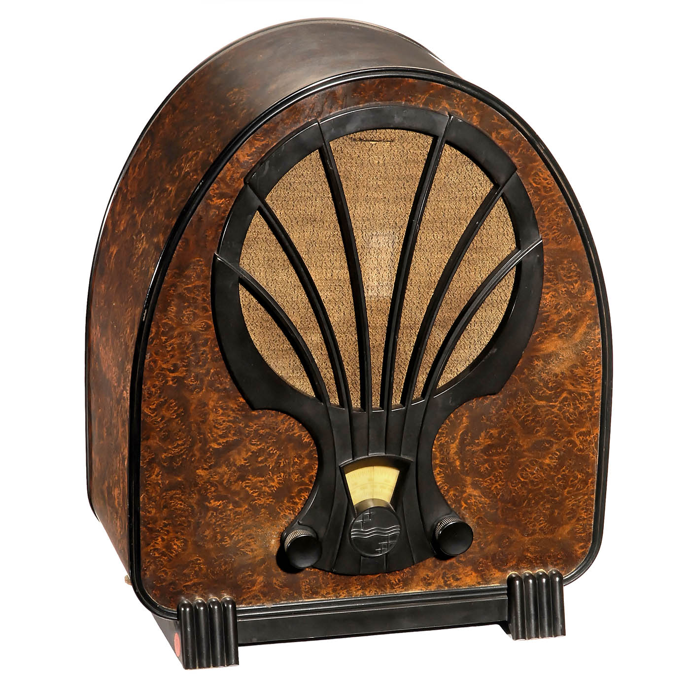Philips France. Each with 5 tubes, MW + LW, mains-operated, integrated loudspeakers. 1) Model 830A, Arbolite case, bakelite base and frames, 1931. - And: 2) Modell 834A, Arbolite case, bakelite front, wood base, 1933.