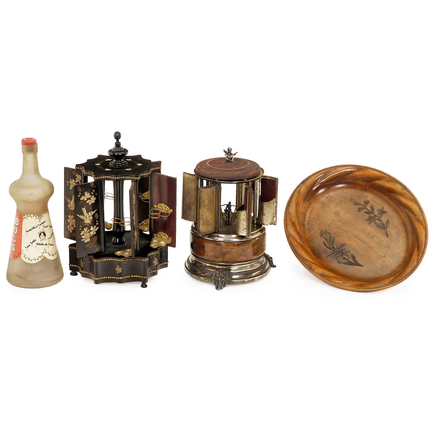 1) Cigar temple, nickeled tin, imitation amber insets, 3 grimacing mask feet, 1 air "Doctor Shivago", c. 1965. - 2) Fruit bowl, wood, carved edelweiss motifs, 2-air Thorems movement, c. 1930. - 3) Bols liqueur bottle, single-air movement in the base, c. 1950. - And: 4) Cigar dispenser, ebonized wood, painted flower and bird motifs, 1 air, c. 1920.