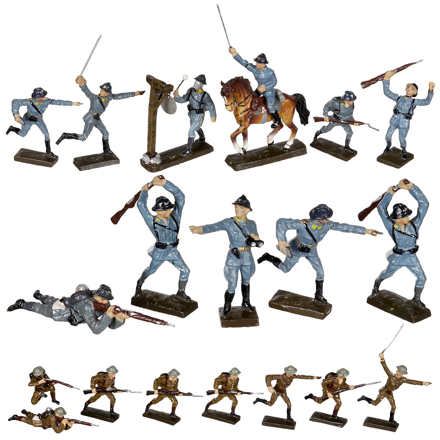 Composition figures, 3 in., 11 French soldiers, including gas warner, rider and sharpshooter, 8 English soldiers. Good condition.
