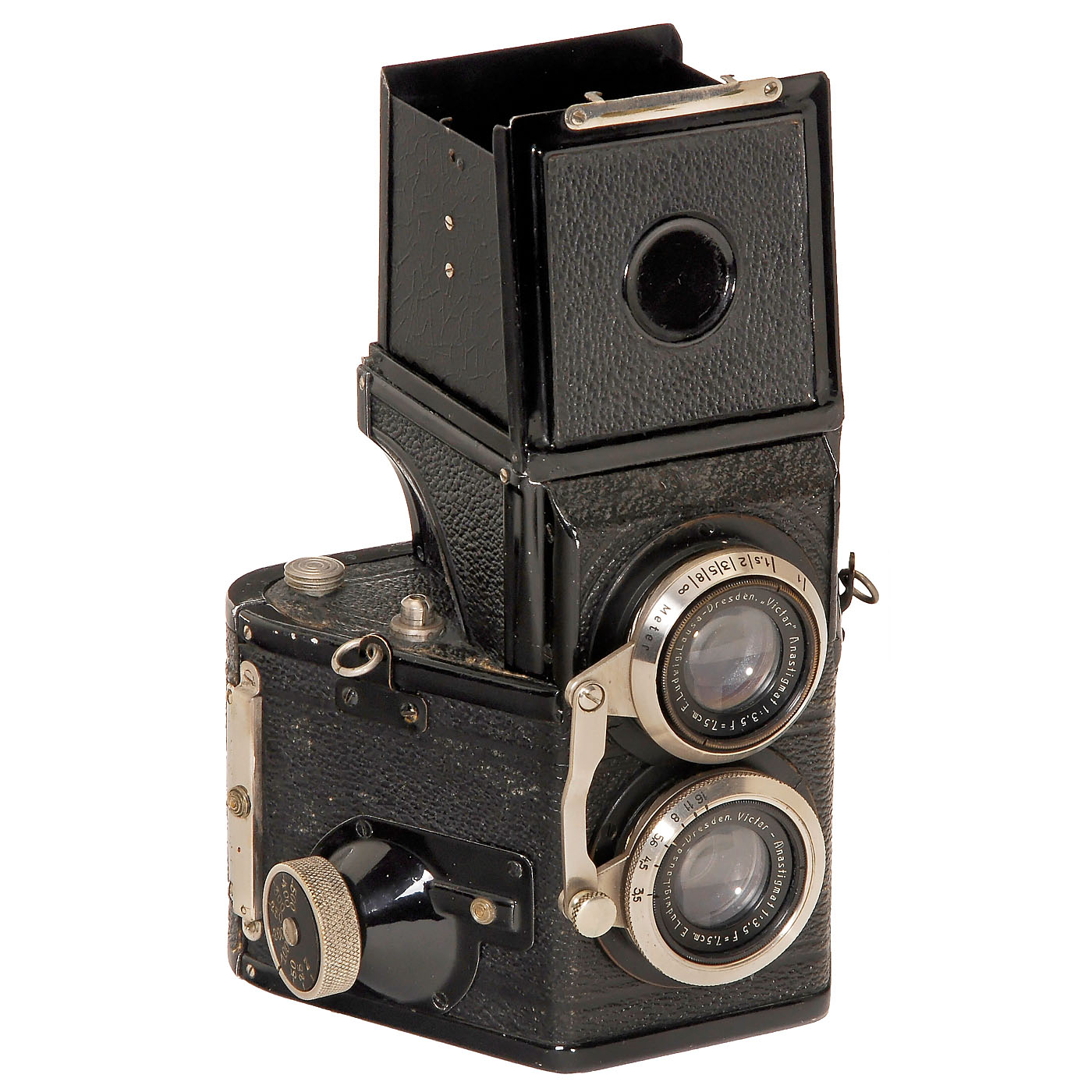 Karl Arnold, Marienberg. Size 6 x 6 cm on film type 120. With Victar-Anastigmat 3,5/7,5 cm, focal plane shutter 1/25–1/500 sec. (second shutter curtain stuck), coupled lenses. Unusual and very rare TLR camera! With case.