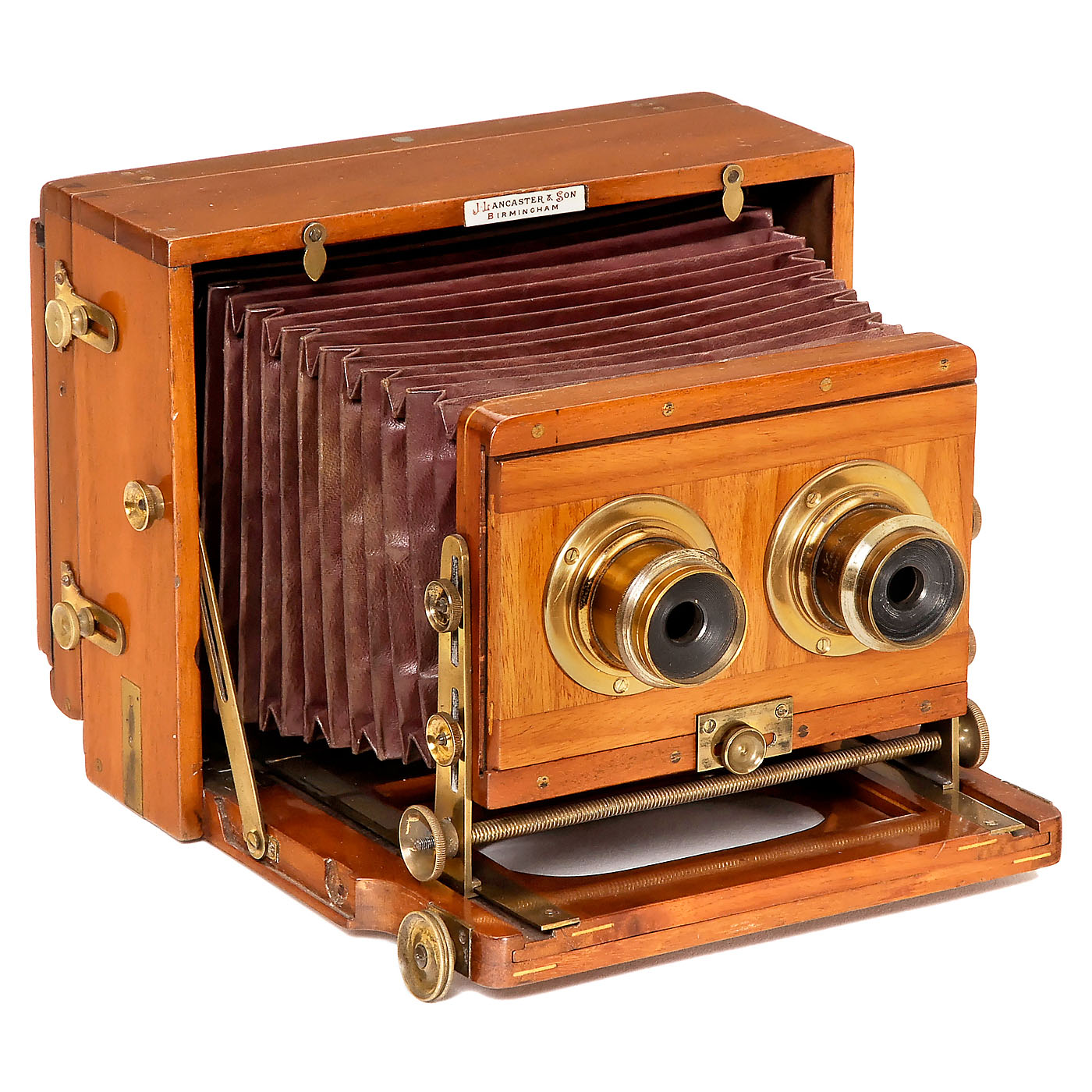 Lancaster & Son, Birmingham. Model 422, size 7 ¼ x 4 ½ in., polished mahogany body with brass fittings, 2 brass "Patent 13 in." lenses by Lancaster with iris stop, dark-red bellows, focusing screen back. – Very rare Instantograph camera!