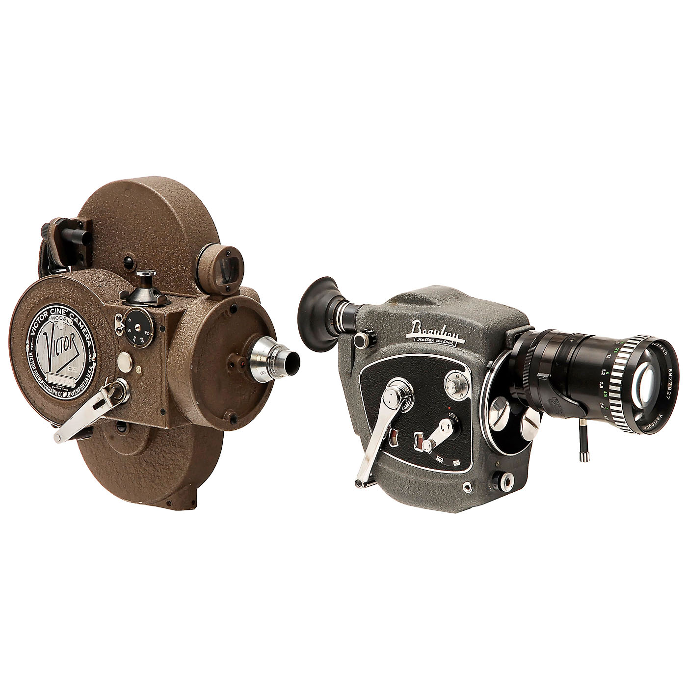 1) Victor, USA. Victor Ciné Camera, for 30m daylight spools, Wollensak fix-focus lens, clockwork drive 8–64 p/s. – 2) Meopta, CSSR. Admira Electric, for 30m daylight spools, lens: Meopta 1:1,8/20 mm, Newton viewfinder, electric drive with separate battery box. Rare version of an Admira – And: 3) Beaulieu, France. Beaulieu Reflex-Control, for 30m daylight spools, lens: Angenieux-Zoom 1:2,2/17–68 mm, clockwork drive 8–64 p/s. – In addition: Beaulieux Reflex-Control 8, for 2x8mm film.