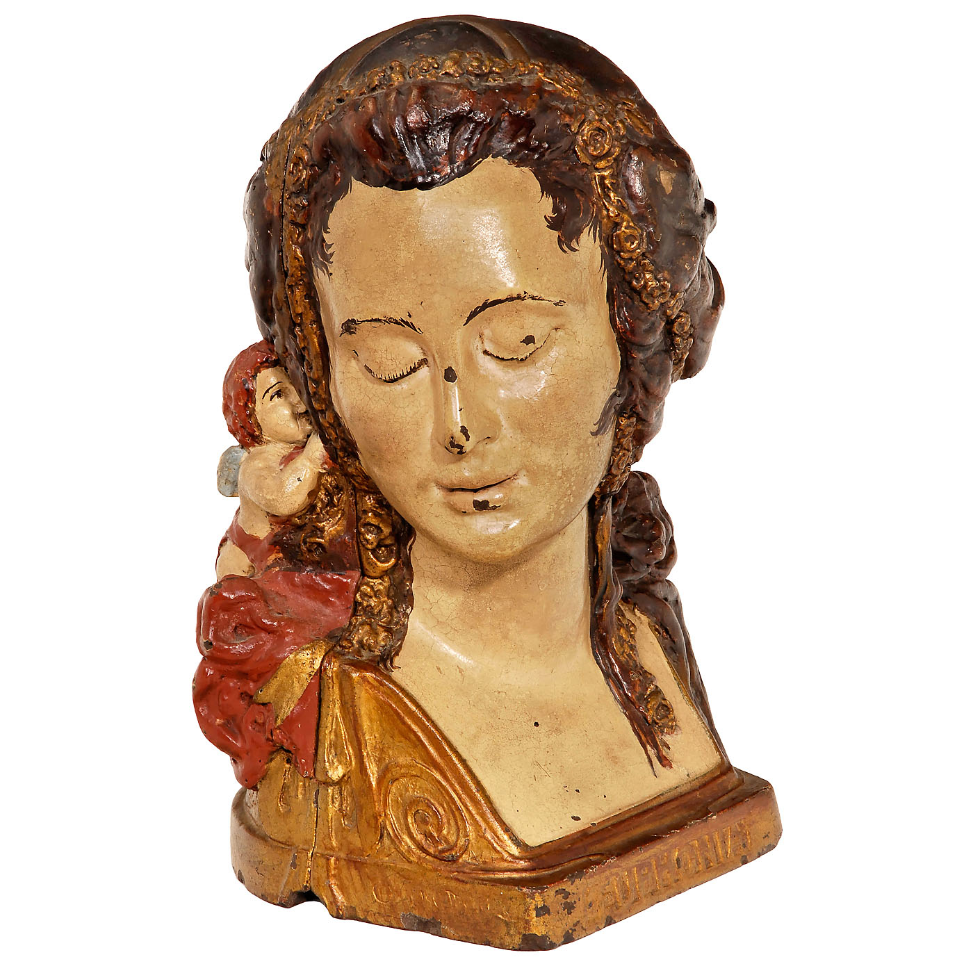 Euphonia by L.C. Mayer. Plaster composition bust with two cherubs in her hair. Designed to hide the "unattractive" new communication devices, the hinged telephone covers were intended to harmonize with the aesthetic interior decoration of the period. - 13 2/3 in. high. (minor chips). Marked: "Copyright by L.C. Mayer". With Select-O-Phone candlestick telephone from 1917 (telephone needs restoration). - Literature: 1) John J. Dommers, "The Telephone Connection", 1983, p. 76. - And: 2) Kate E. Doomer, "Telephones", 1992, p. 157. - Extraordinarily rare!
