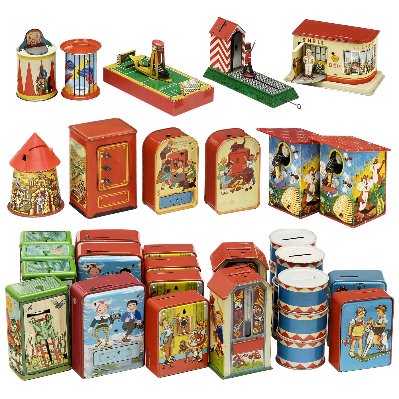 Lithographed tin, manufactured by Geobra, Michael Seidel, Lorenz Bolz etc., including 2 chocolate vendors, a filling station, a safe, 10 counter banks, mechanical frogs and birds and a football game. 12 of them with keys.
