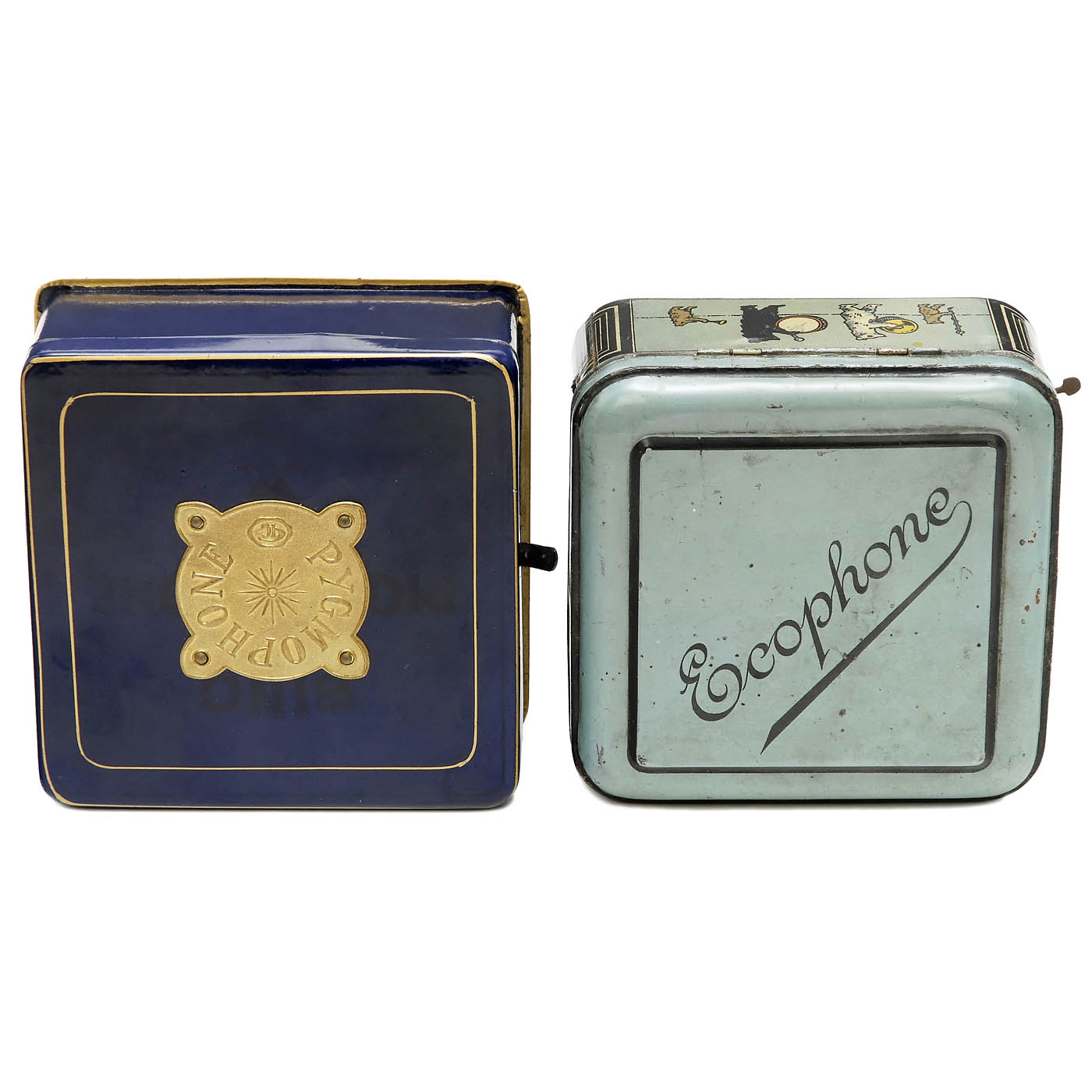 1) Pygmophone, CIC, France. Japanned tin, brass maker's plaque on lid, spring-driven, working. - 2) Ecophone, Germany, maker unknown. Lithographed tin, spring-driven, working. - And: 3) Gama Nette, Georg Adam Mangold, Fürth, Germany. Lithographed tin, spring-driven, working.