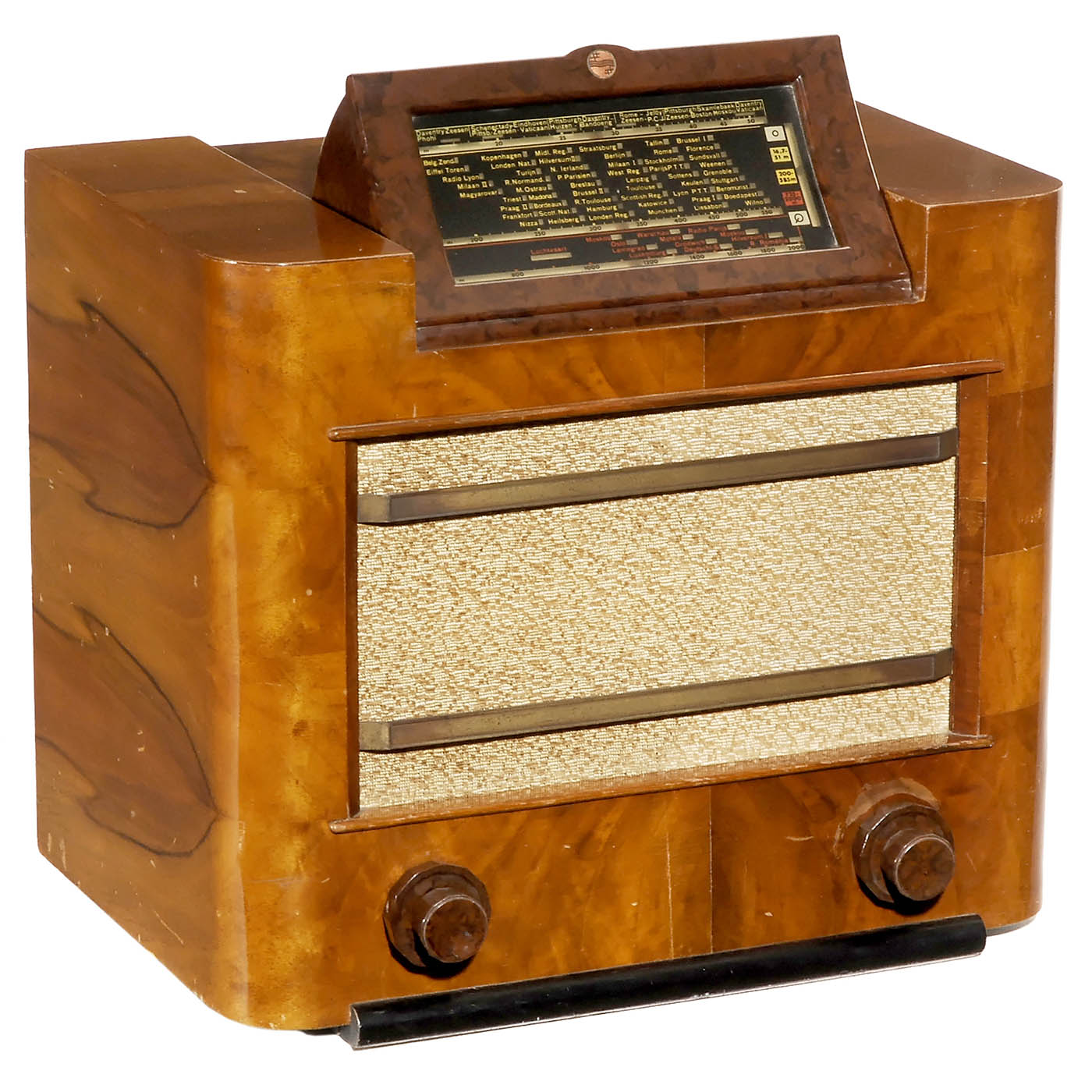 1) 736A, super-inductive, 6 tubes, wood case, 1934. - 2) 836A, super-inductance, 5 tubes, wood case, 1935. - 3) BX400A, Superhet, 5 tubes, bakelite case, 1950. - 4) 456A, Superhet, 5 tubes, wood case, 1936. - 5) BX378A, 6 tubes, bakelite case, 1947. - And: 6) 738B, Super-Inductance, 6 tubes, wood case, 1935. - All radios: mains-operated, integrated loudspeakers, complete with rear panels.