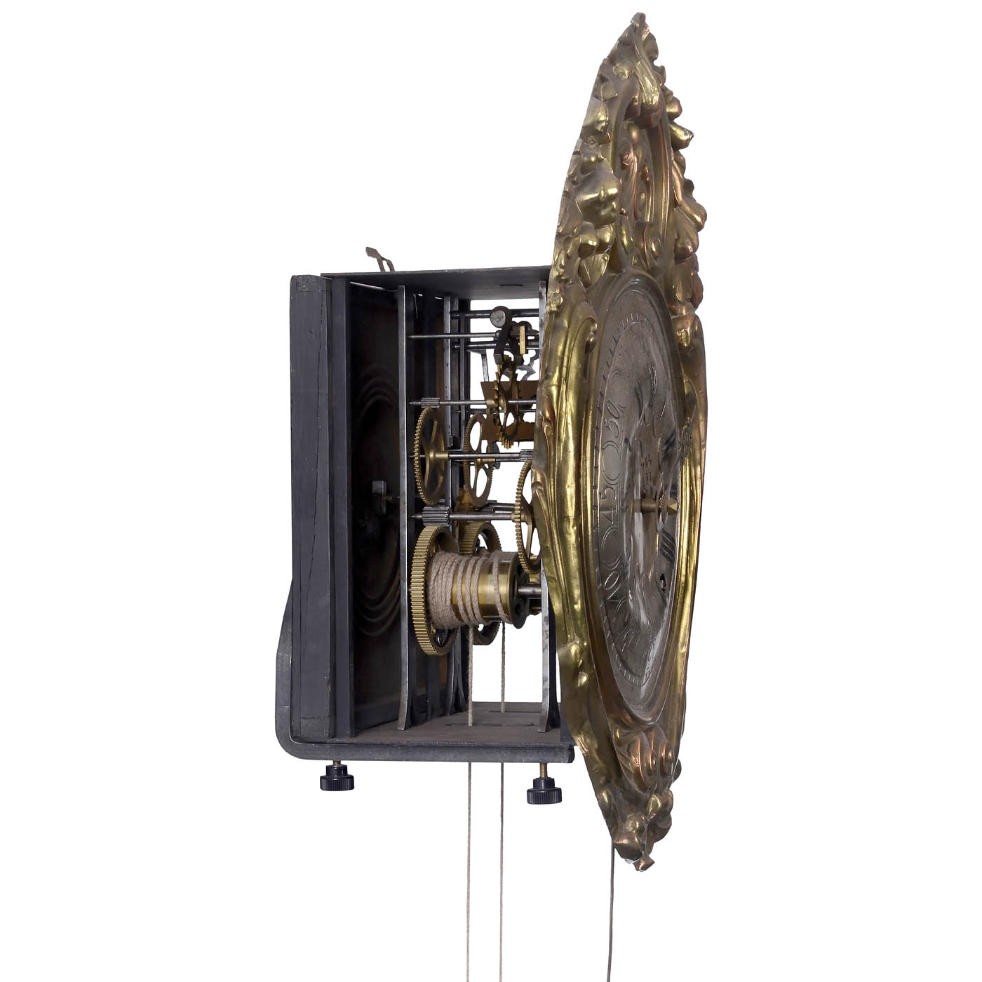 Embossed brass dial, Roman numerals, 2-train movement, weight-driven, anchor escapement, brass wheels, half-hour strike on spiral gong, working (not guaranteed).